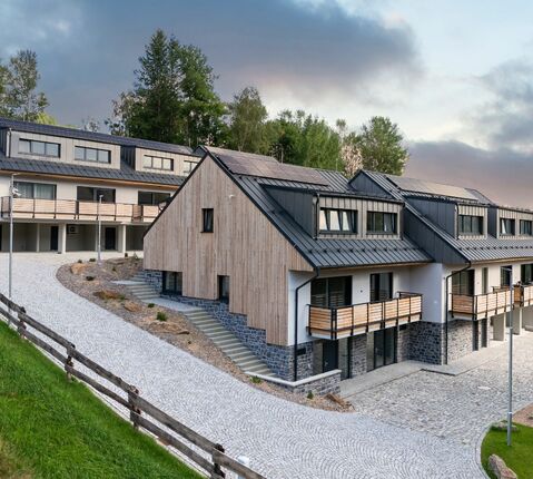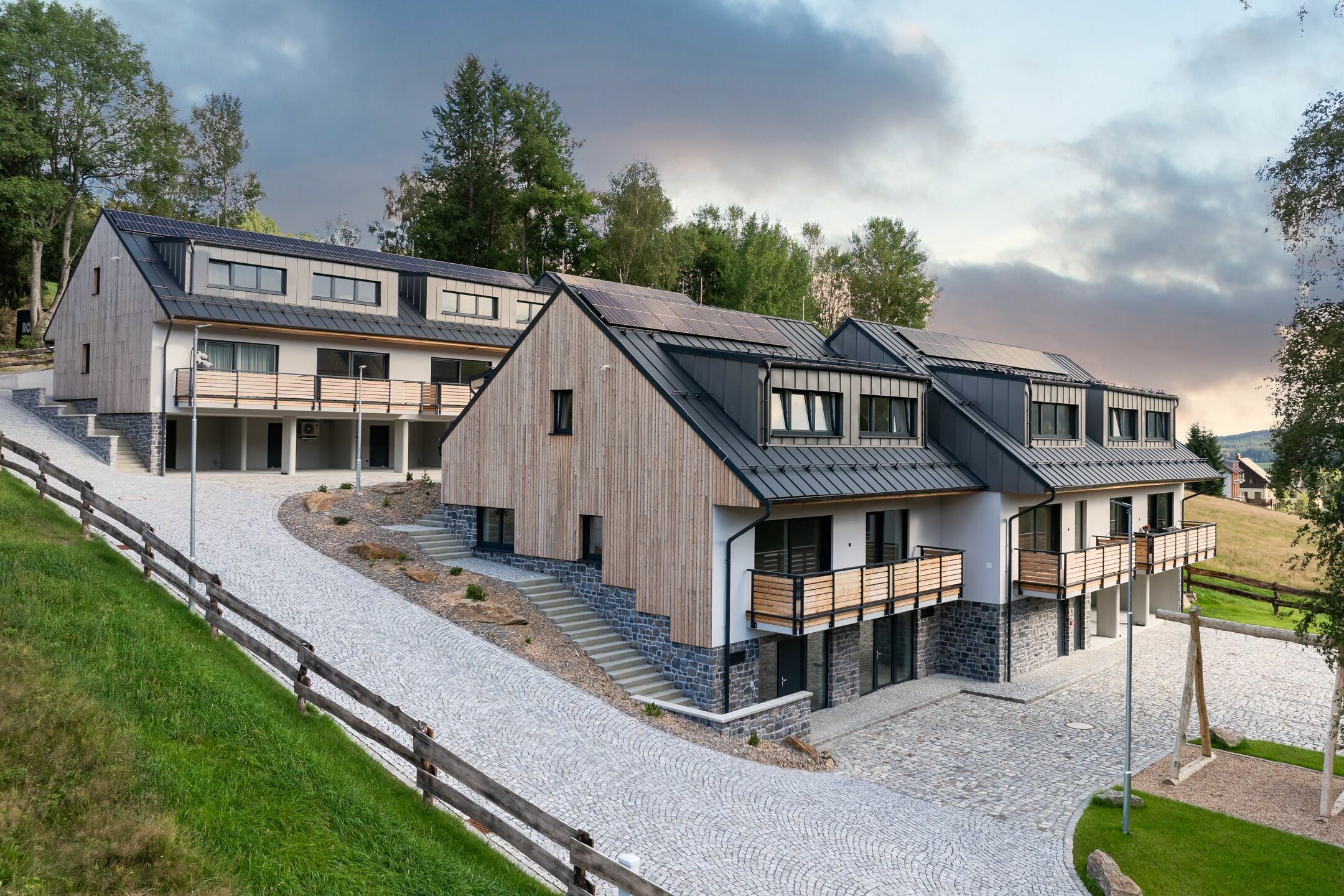 Resort je oplocený, na vjezdu s automatickou bránou, napojený na zpevněnou obecní komunikaci a chráněn kamerovým systém. Na pozemku je také dětské hřiště a ohniště. Otopný systém je doplněn fotovoltaickými panely na střechách obou budov. Takto získanou elektrickou energii mohou společně využívat obyvatelé resortu pro provoz svých domácností.