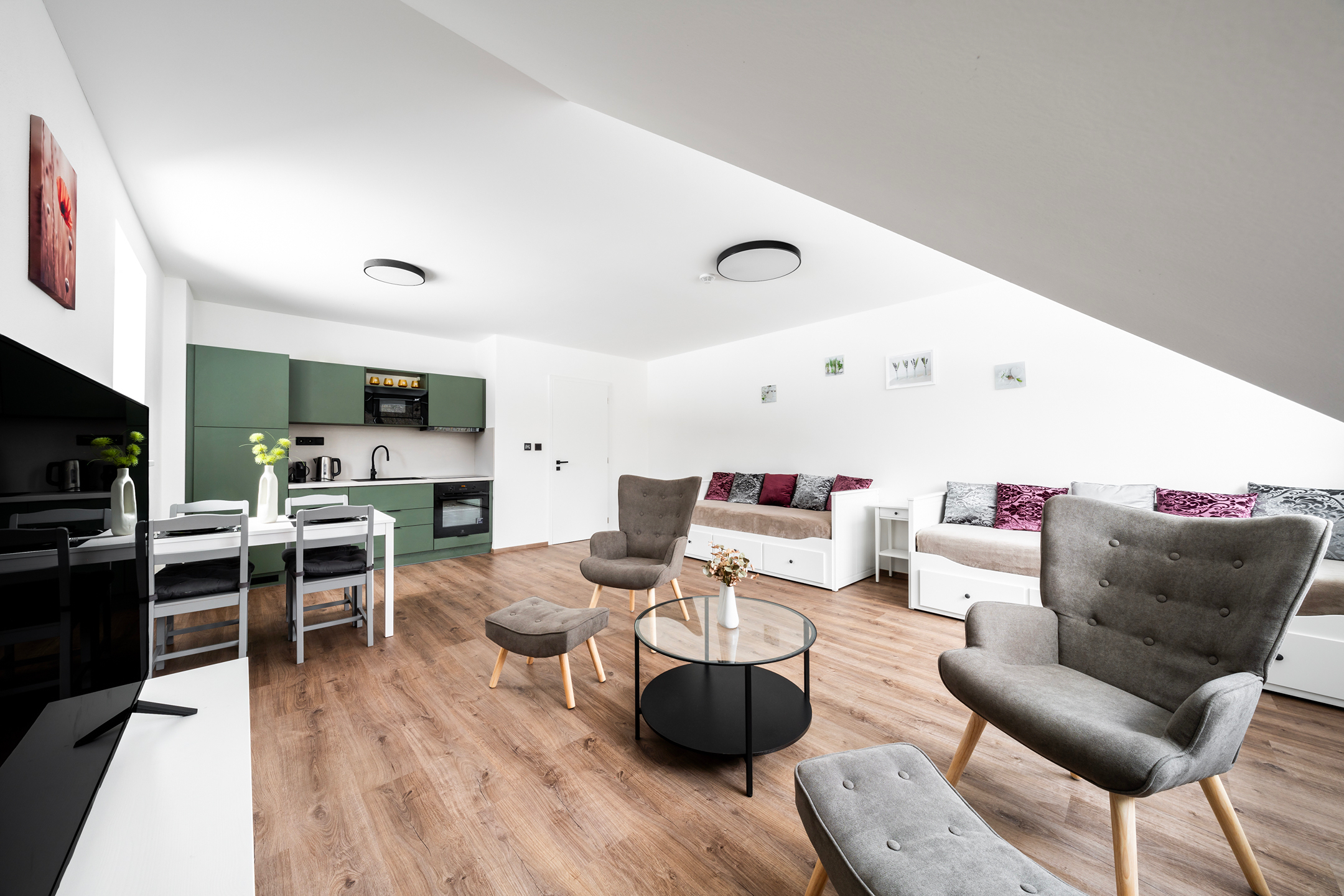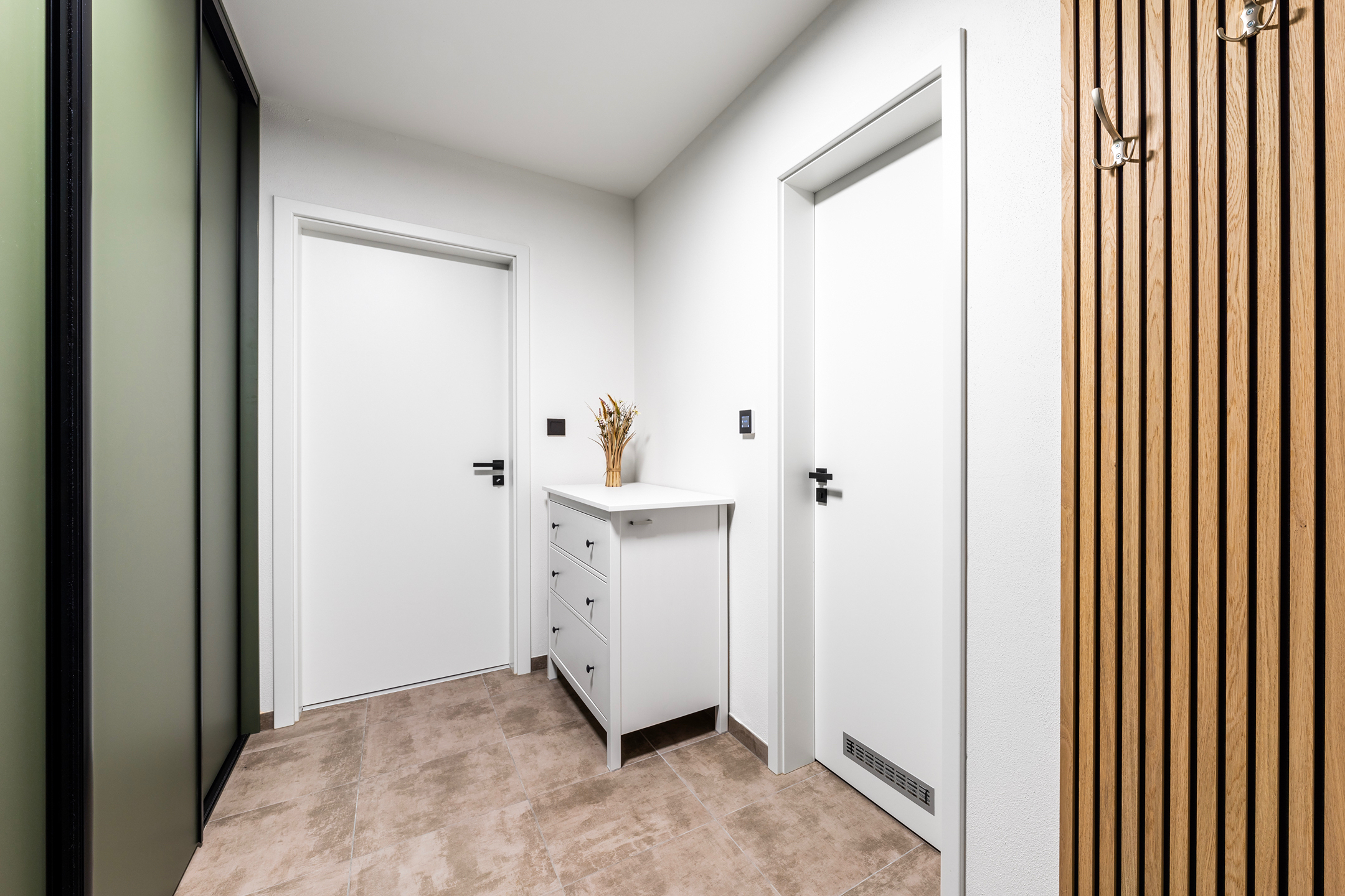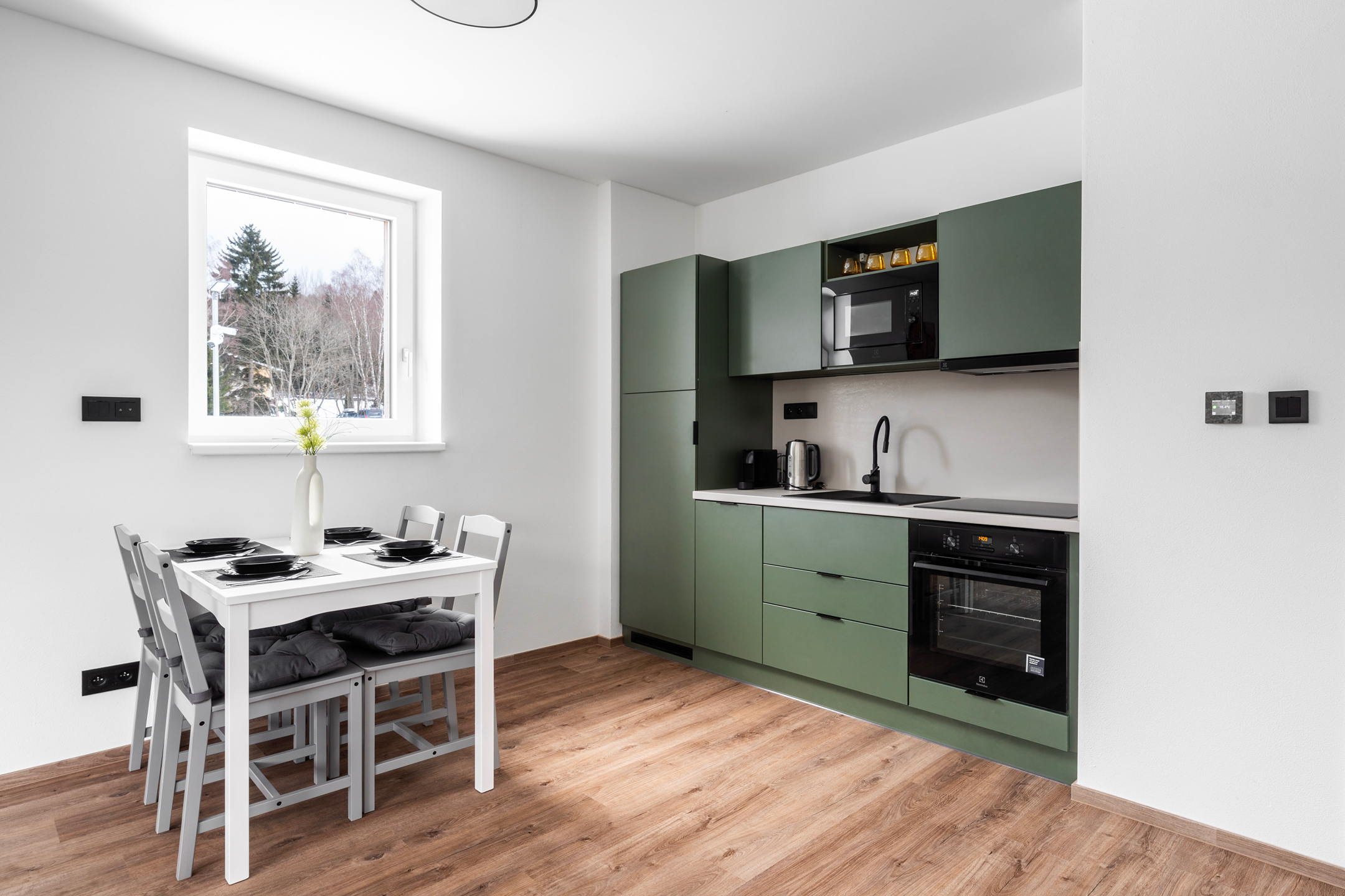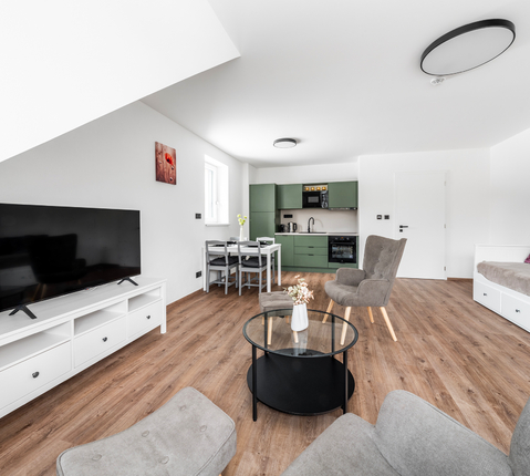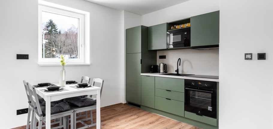 Apartmán je dokončen v nadstandardním provedení, které zahrnuje kvalitní plastohliníková okna s izolačním trojsklem, venkovní žaluzie, podlahové vytápění, v koupelně navíc s topným žebříkem, elektrický zásobníkový ohřívač vody, zabezpečovací zařízení JABLOTRON s aplikací pro dálkové ovládání alarmu i celé domácnosti (ovládání topení či venkovních žaluzií), interiérové dveře bílé s obložkovými zárubněmi, lepené vinylové podlahy v kombinaci s keramickou dlažbou, obklady či sanitu od renomovaných výrobců. Internet přes optické kabely zajišťuje společnost CETIN. Součástí vybavení je také na míru vyrobená kuchyňská linka včetně vestavné elektrické trouby, varné desky, digestoře, myčky nádobí a ledničky s mrazákem, a dále vestavěná šatní skříň s množstvím úložného prostoru v předsíně.