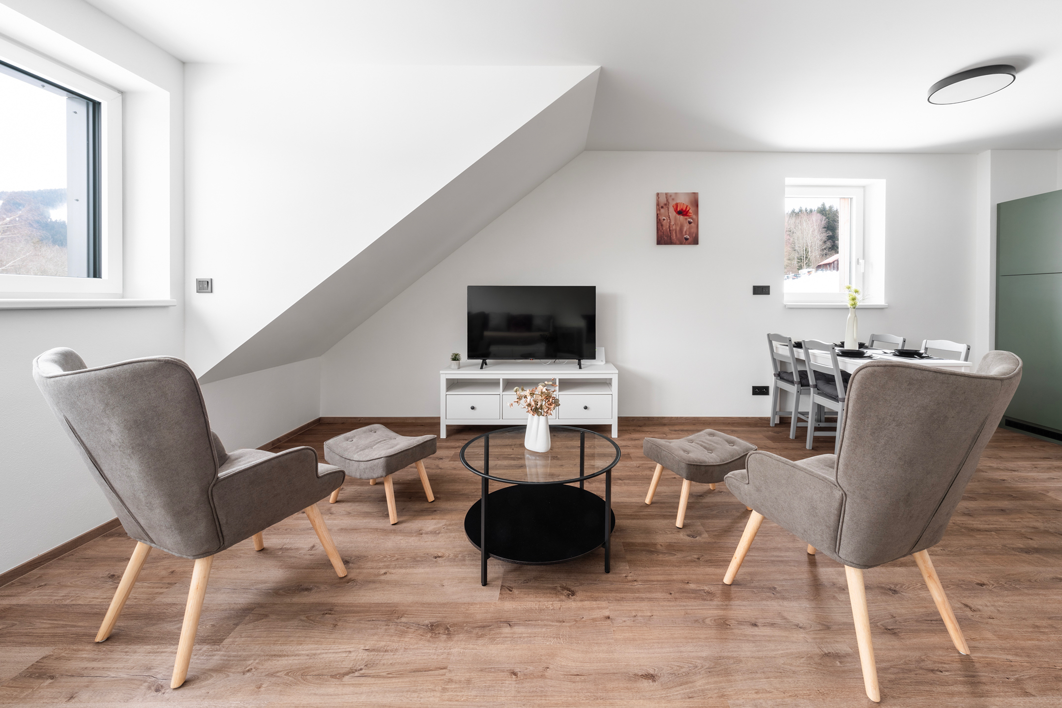 Interiér je rozdělen na pokoj spojený s kuchyňským koutem, předsíň a koupelnu s toaletu. Množství oken v pokoji s kuchyňským koutem nejen příjemně prosvětlí tento prostor, ale zároveň nabízí hezký výhled na okolní přírodu.