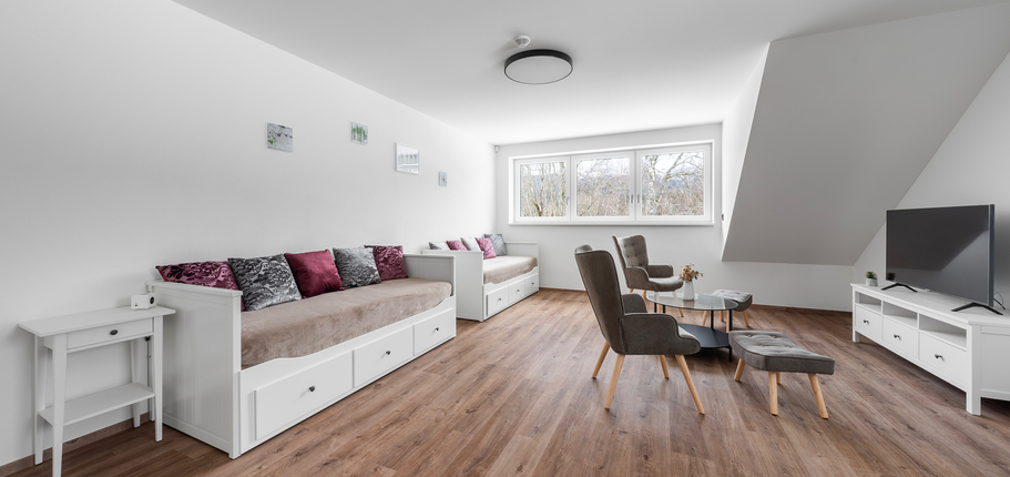 Pro zjištění rozměrů místností a objektů v prostoru využijte možnost měření ve virtuální prohlídce pomocí ikony pravítka v levém dolním rohu.