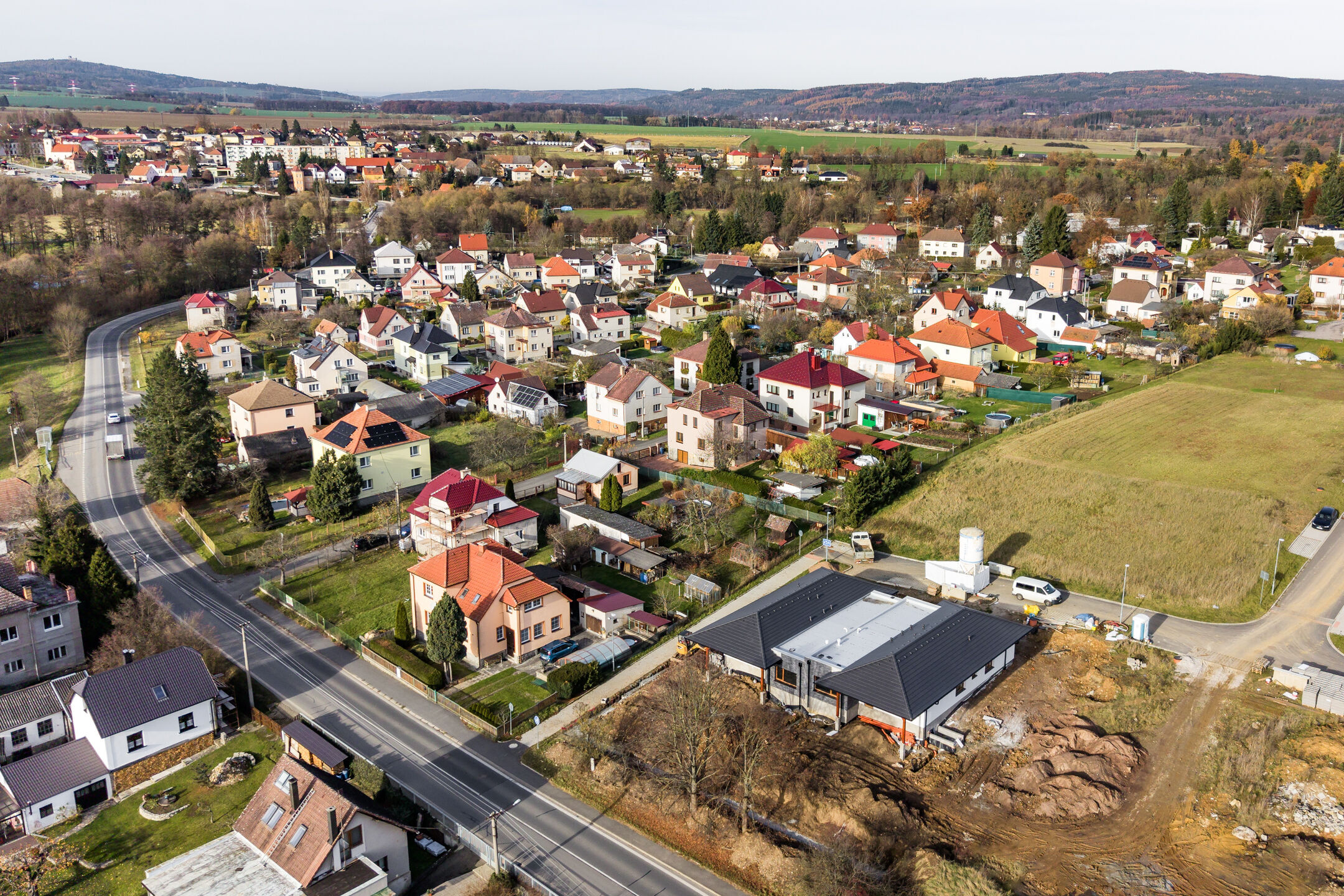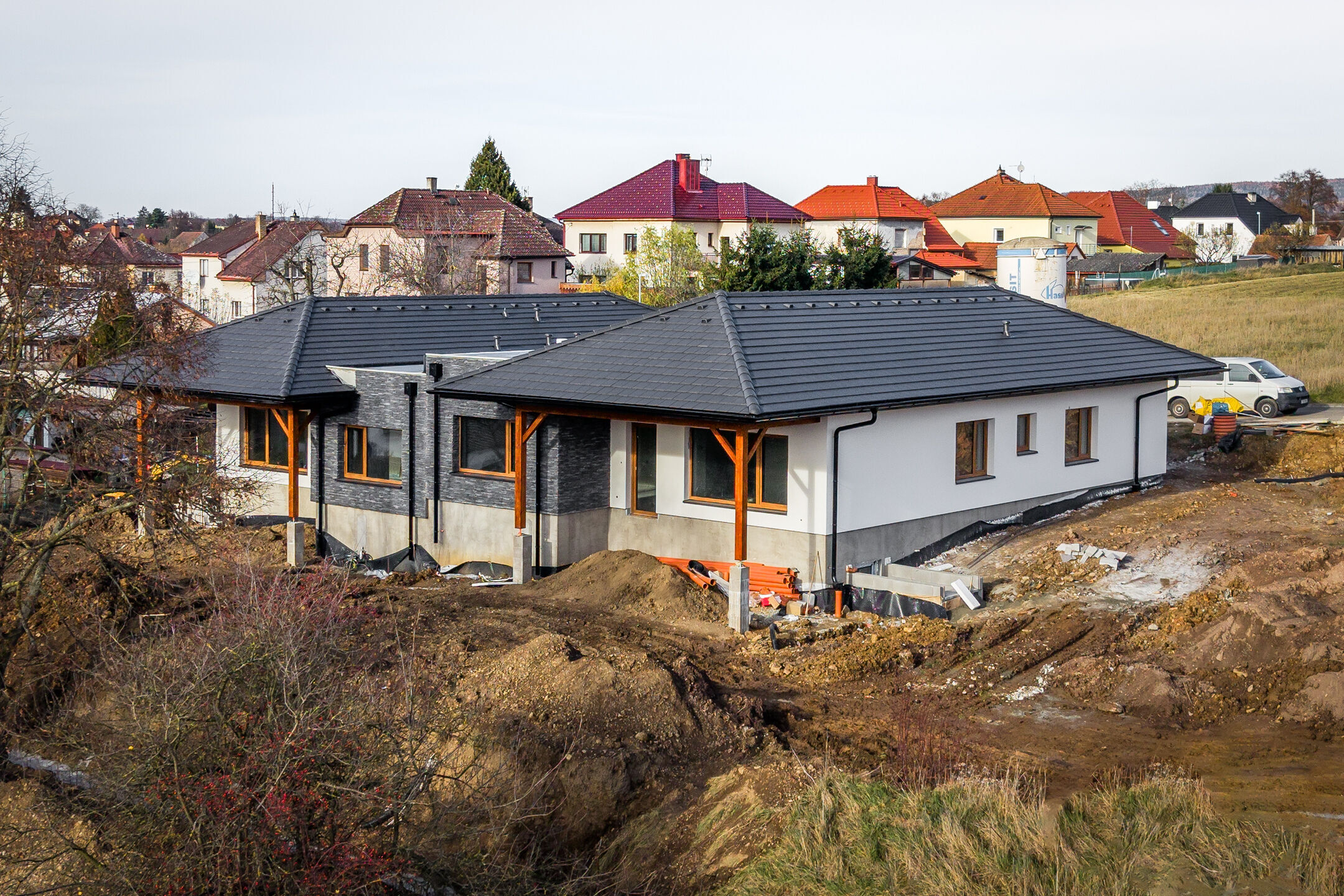 Dům je napojen na elektřinu, vodovod i kanalizaci. Pozemek bude kompletně oplocený, vjezd bude řešen automatickou bránou a vstup vrátky s elektrickým zámkem. Součástí pozemku bude také zpevněná plocha pro parkování dvou automobilů. Přístup je zajištěn z veřejné obecní komunikace.