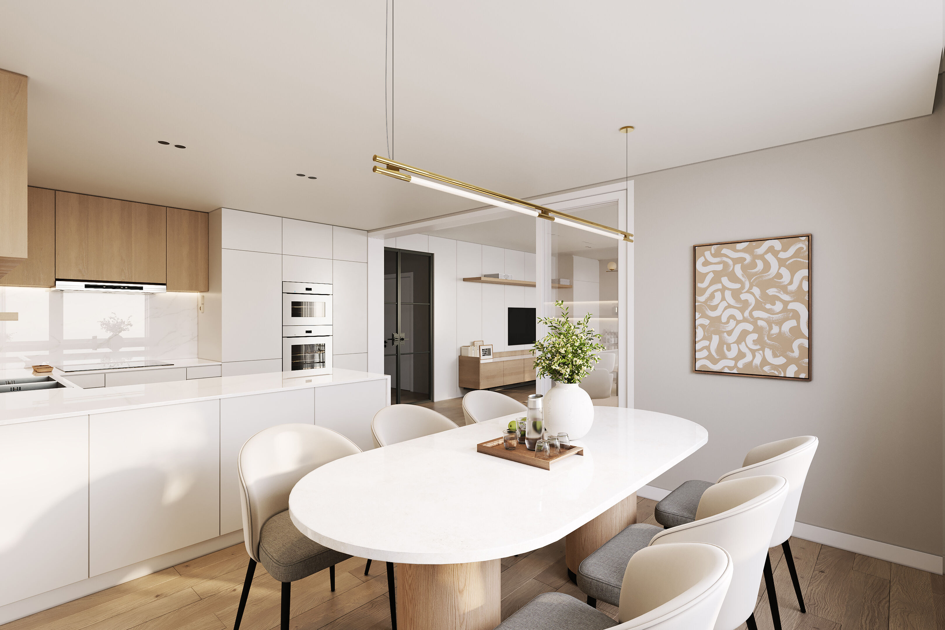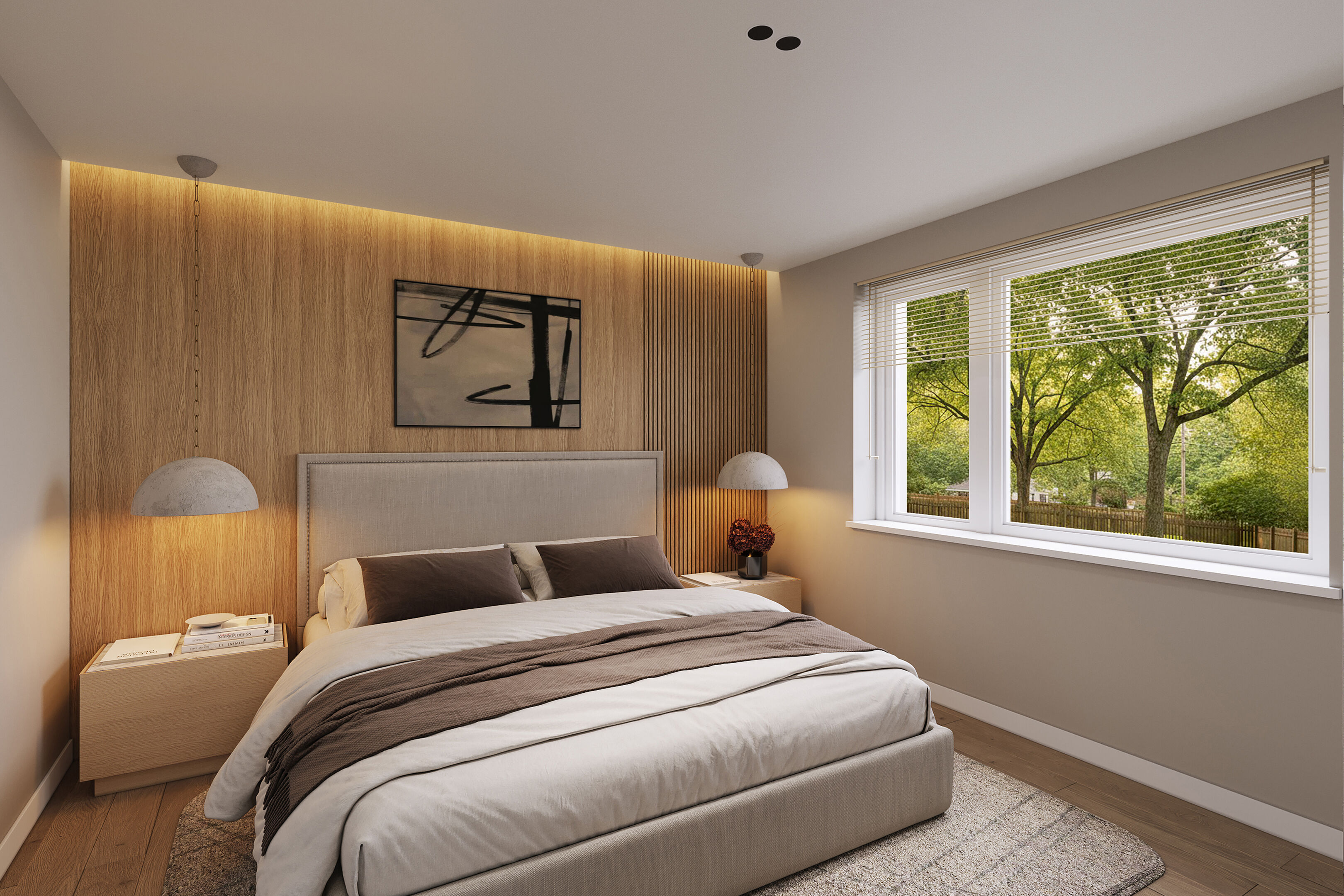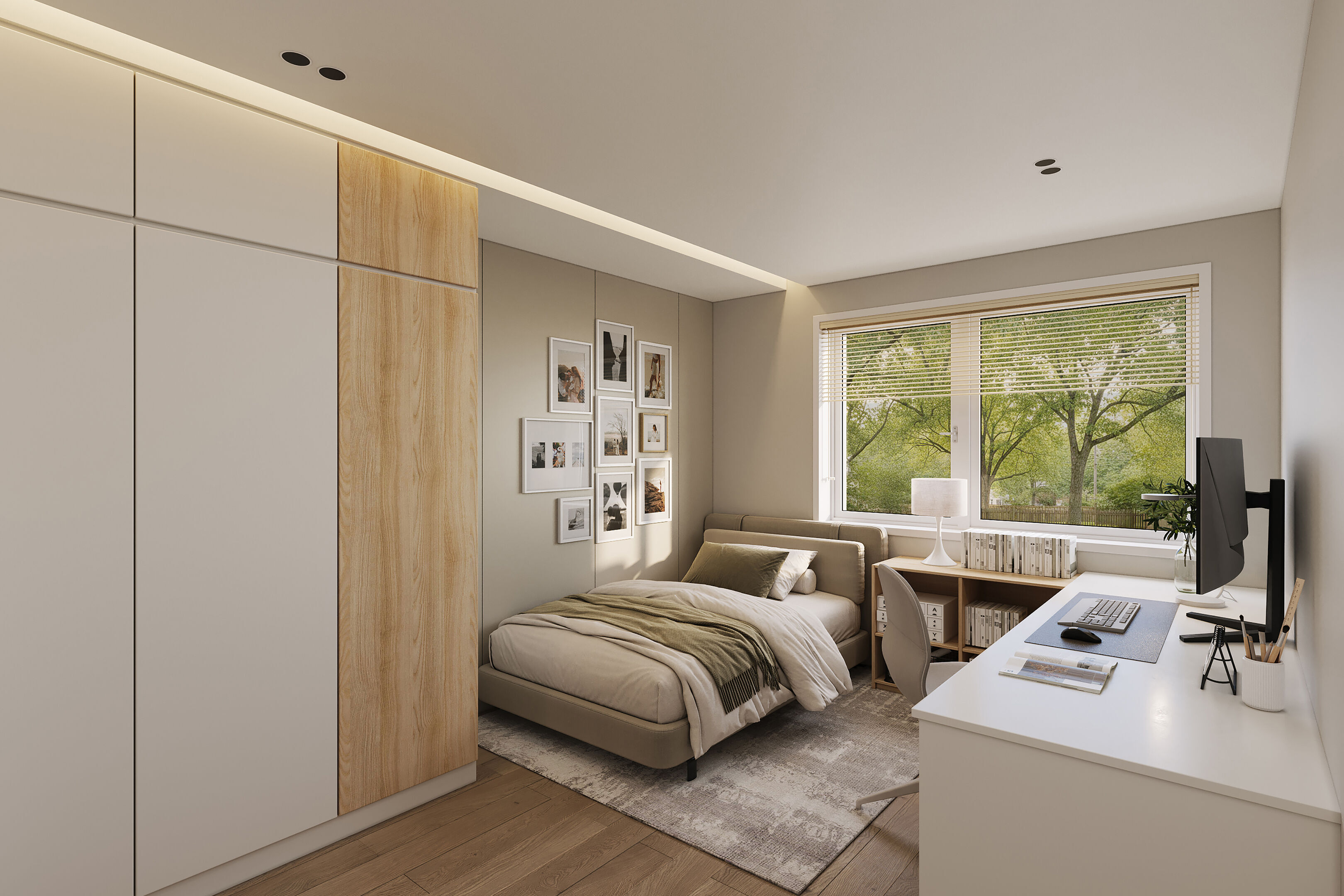 Interiér domu je řešen prakticky. Z centrální chodby uprostřed objektu se vstupuje do obývacího pokoje s kuchyňským koutem a jídelnou, dvou dětských pokojů, pracovny a hlavní ložnice. Hlavní ložnice disponuje vlastní šatnou a koupelnou přístupnou pouze přes ložnici. Z centrální chodby je dále přístupná druhá koupelna a technická místnost určená pro tepelné čerpadlo, pračku a sušičku. Z obývacího pokoje je zajištěn přímý výstup na terasu. Dům je částečně podsklepený. Sklep (39 m2) je přístupný ze zahrady.
