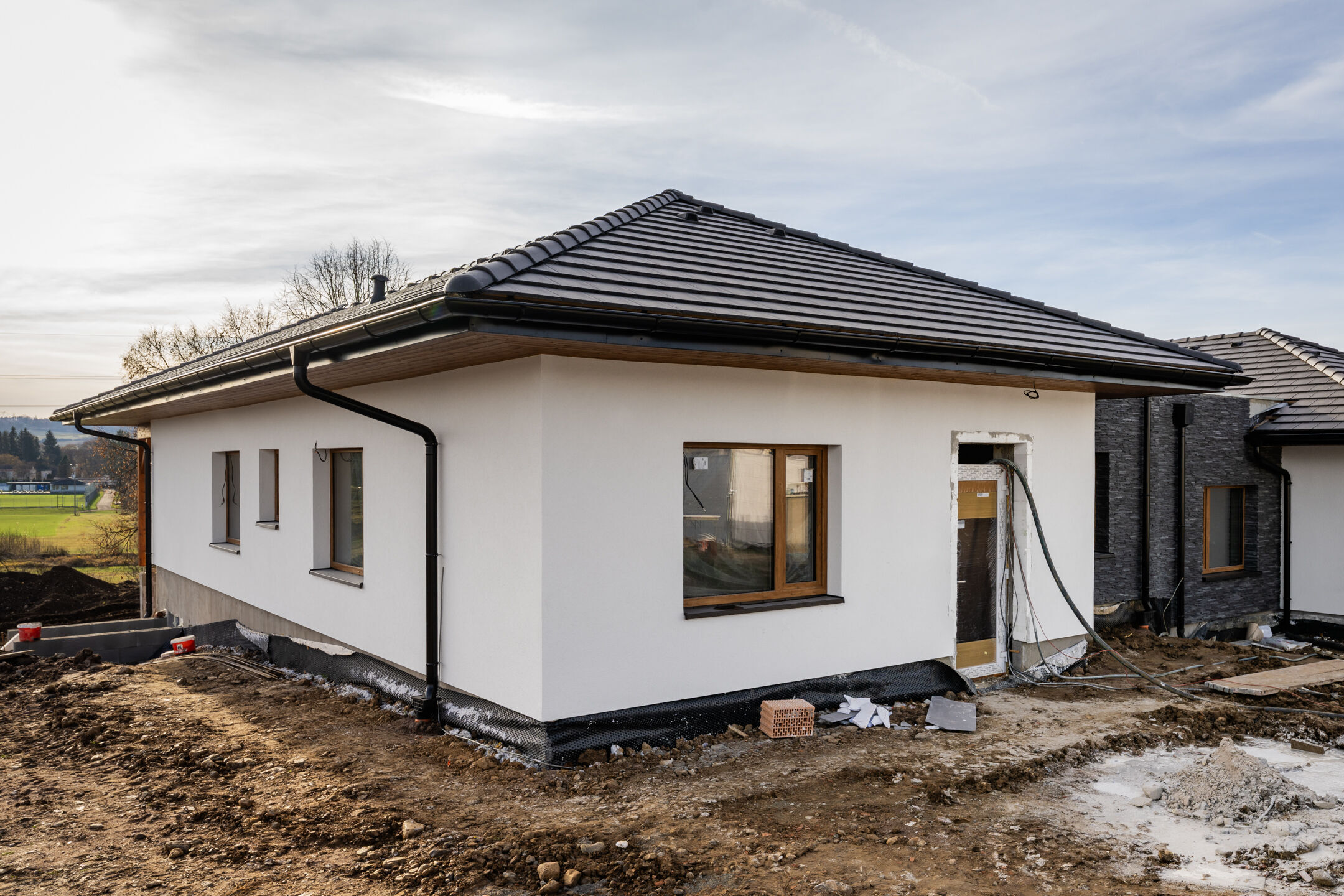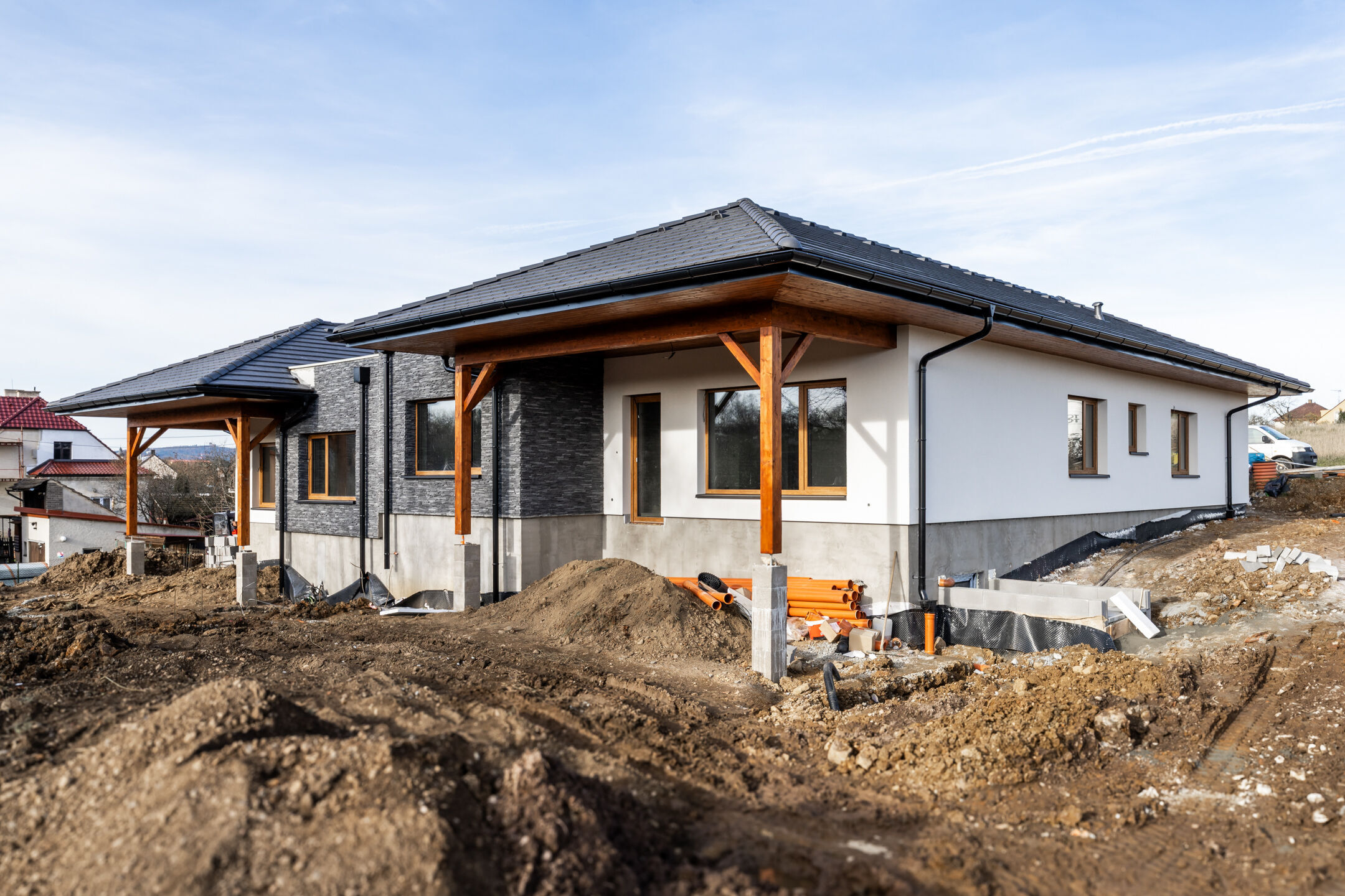 Rodinný dům z keramického zdiva s kvalitní tepelnou izolací bude dokončen v nadstandardním provedení, které bude zahrnovat kompletní vnitřní rozvody a instalace, plastová okna a dveře s izolačním trojsklem, teplovodní podlahové vytápění s regulací v každé místnosti, interiérové dveře se zárubněmi, vinylové podlahy v kombinaci s keramickou dlažbou, obklady a sanita od renomovaných výrobců. Připraveny jsou také rozvody pro kuchyňskou linku, klimatizaci, venkovní žaluzie i fotovoltaickou elektrárnu. Vytápění i ohřev vody zajistí tepelné čerpadlo Daikin Altherma 3 R, které garantuje vysoký komfort při velmi nízkých provozních nákladech.