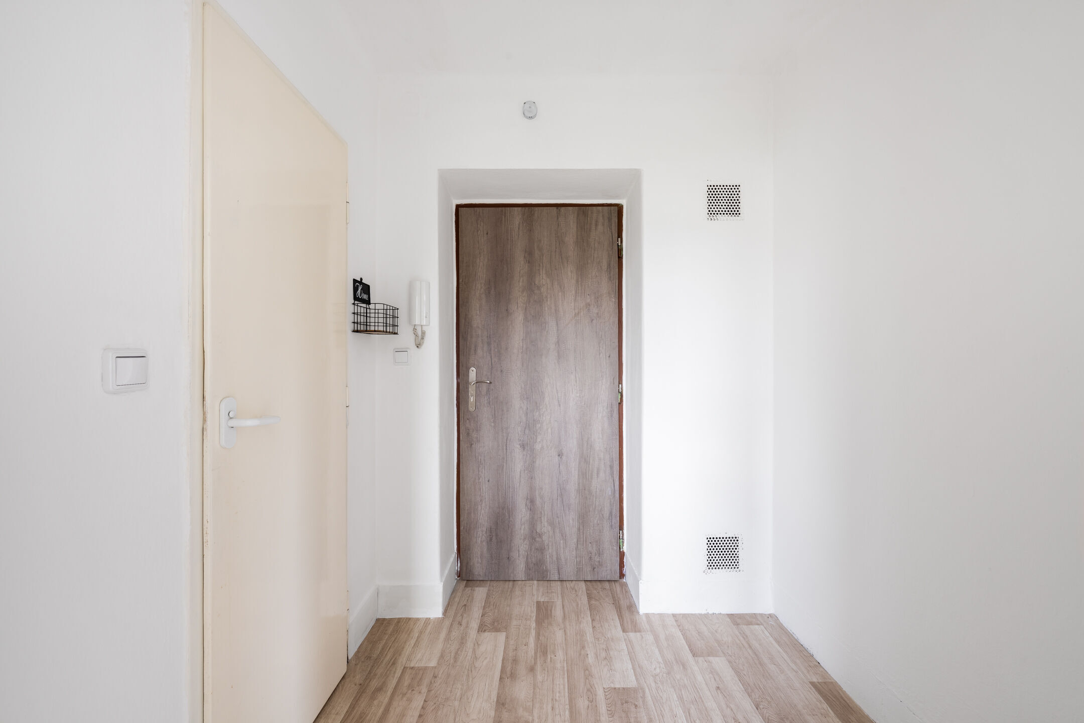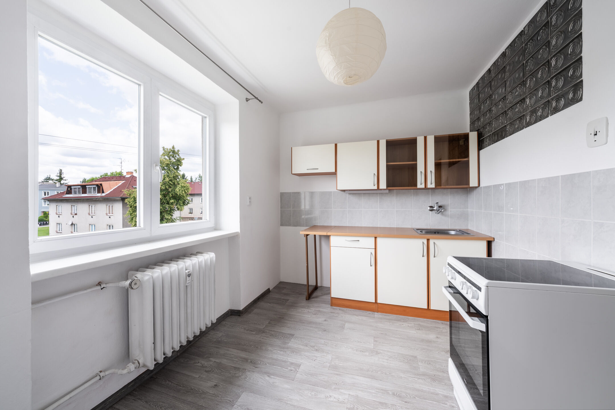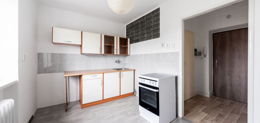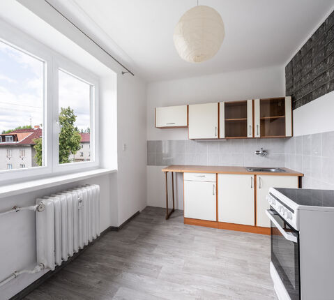 Zařízená je pouze kuchyňskou linkou včetně elektrického sporáku. Vytápění je ústřední, totéž dodávka teplé vody.