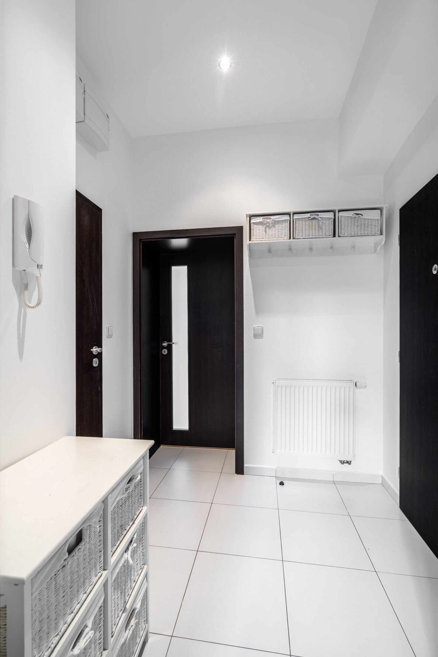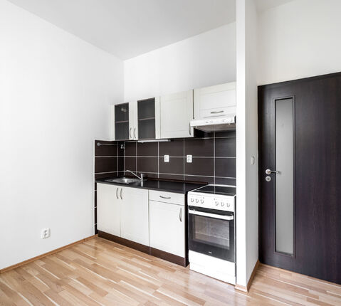 Dispozici tvoří pokoj, kuchyň, předsíň a koupelna s toaletou. Součástí vybavení je kuchyňská linka s elektrickým sporákem se sklokeramickou varnou deskou a digestoří.