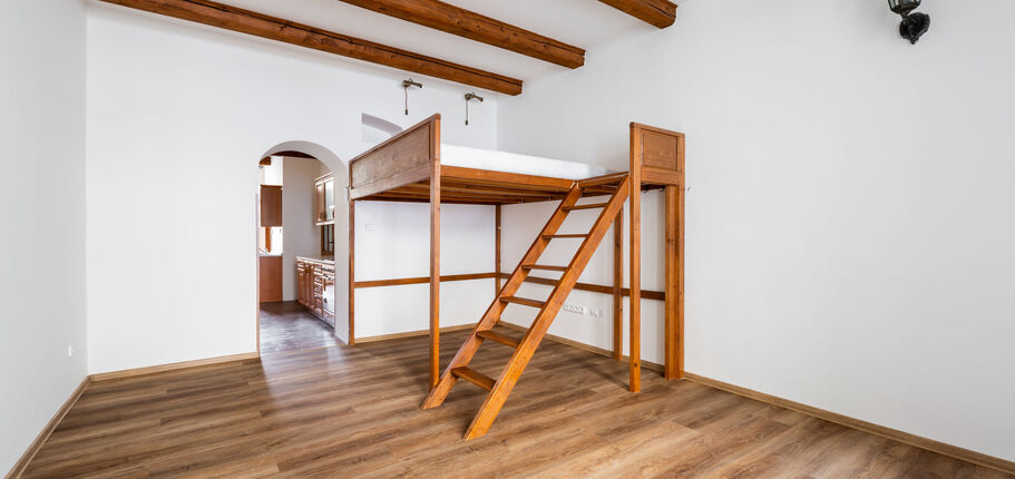 Zařízená je kuchyňskou linkou včetně vestavné elektrické trouby, sklokeramické varné desky, digestoře, dále jídelním stolem s židlemi, vestavěným patrem na spaní s matrací, vestavěnou šatní skříní, věšákem, koupelnovým nábytkem a pračkou.