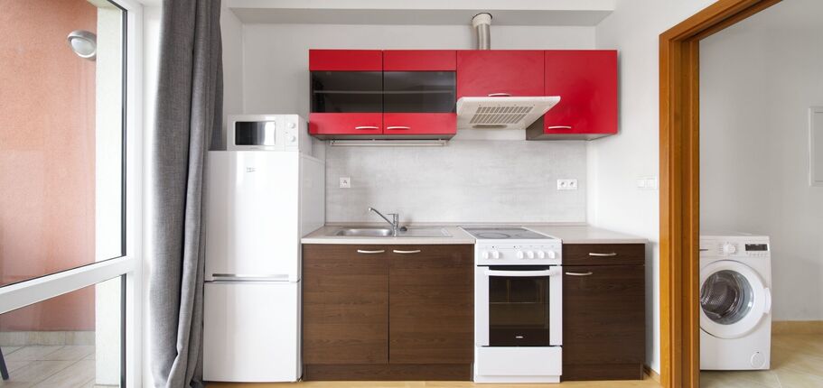 Kuchyňský kout je vybavený kuchyňskou linkou, elektrickým sporákem se sklokeramickou varnou deskou a digestoří. V bytě dále zůstává jídelní stůl a šatní skříň. Vytápění je ústřední, stejně tak i teplá voda je dodávána dálkově. Pro TV přenos je zde společná anténa a internet.