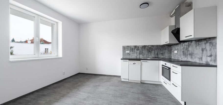 Byt je vybaven moderní kuchyňskou linkou včetně vestavné elektrické trouby, sklokeramické varné desky, digestoře a myčky nádobí. Dále je součástí koupelnový nábytek a kompletní LED osvětlení.