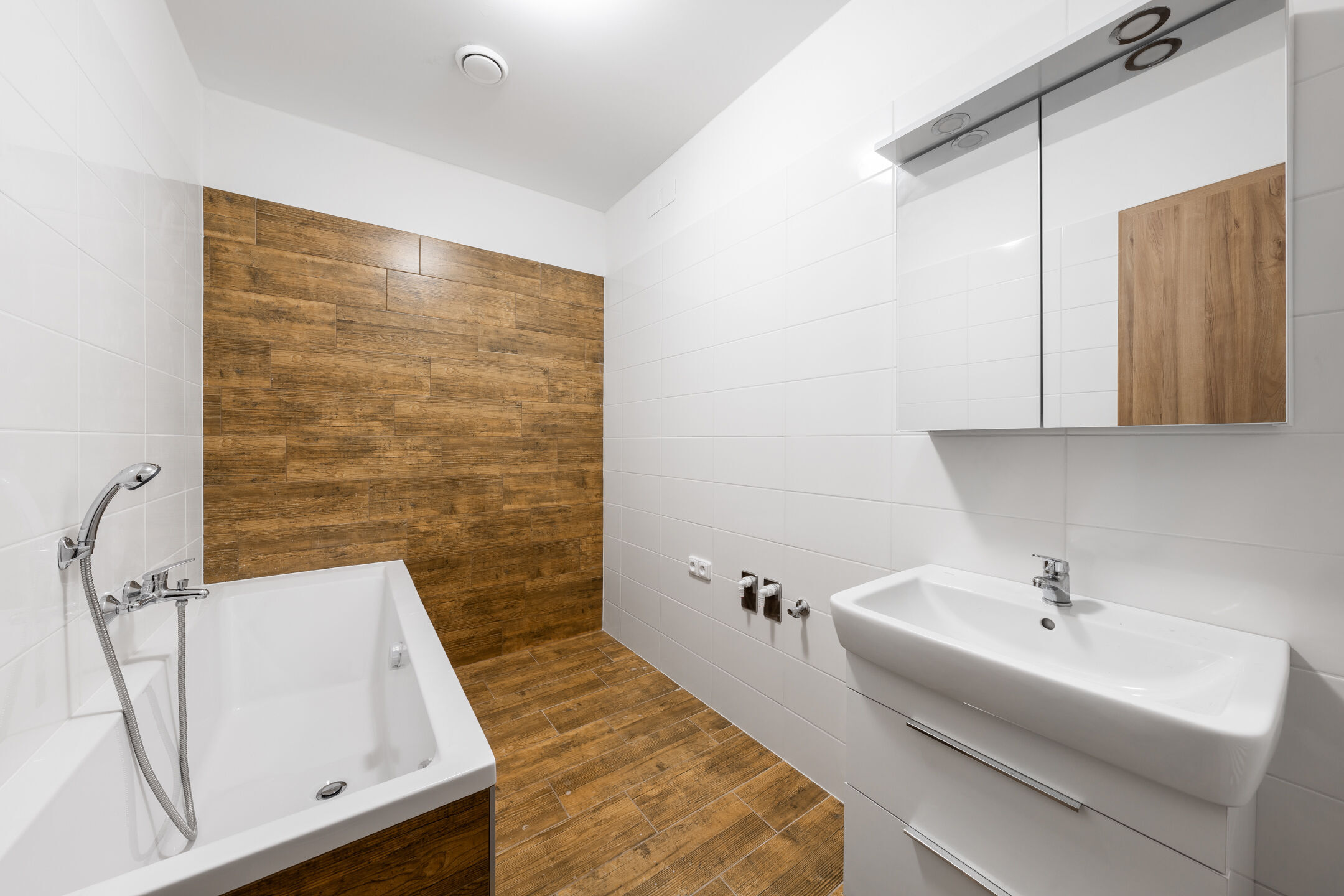 Součástí vybavení je kuchyňská linka včetně vestavné elektrické trouby, sklokeramické varné desky, digestoře a myčky nádobí. Neschází ani koupelnový nábytek, úsporné LED osvětlení a venkovní okenní rolety s elektrickým ovládáním.