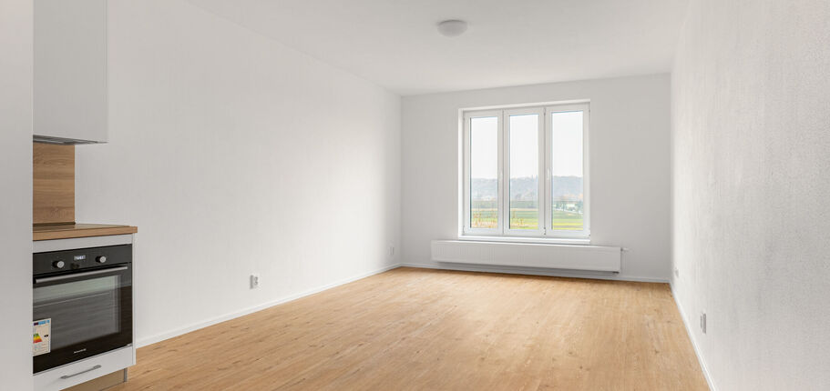 Dispozice zahrnuje obývací pokoj s kuchyňským koutem, ložnici se vstupem na balkon, předsíň a koupelnu s toaletou. Dominantou obývacího pokoje s kuchyňským koutem jsou velká okna s příjemným výhledem do zeleně přilehlého okolí, kudy také protéká řeka Mže.