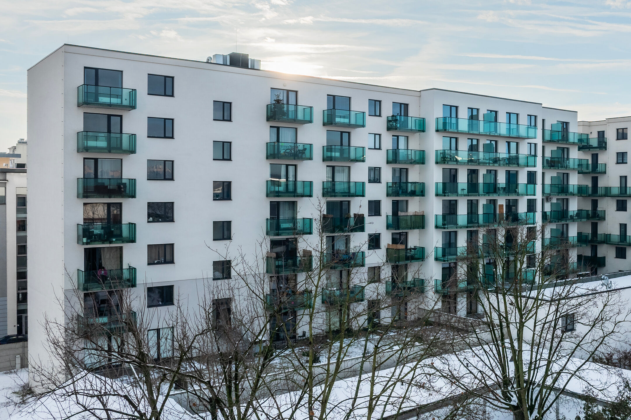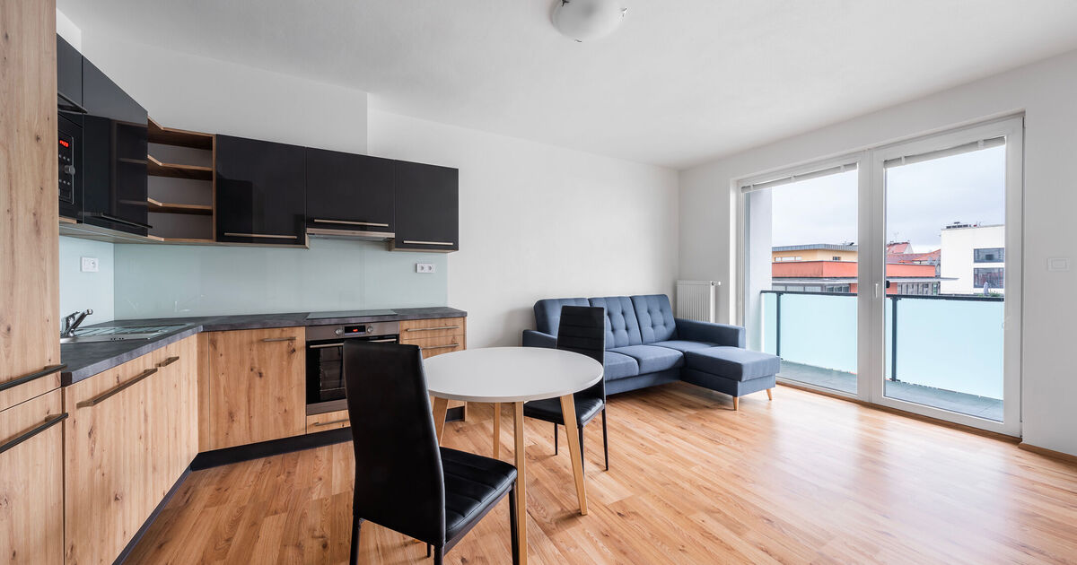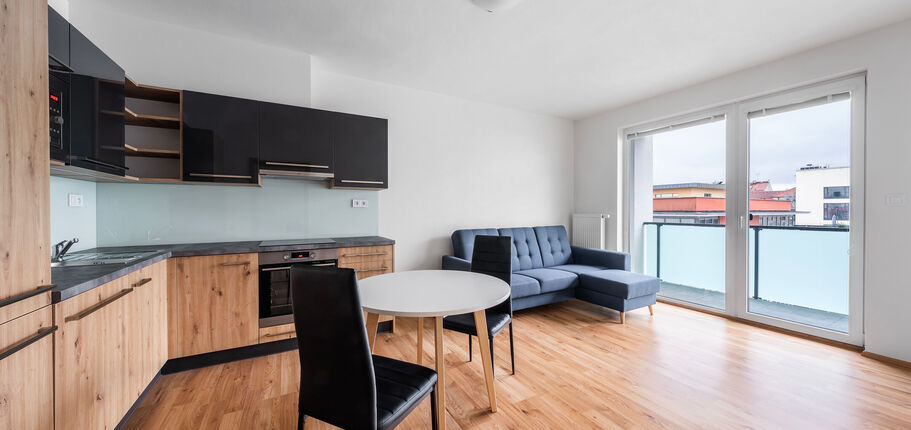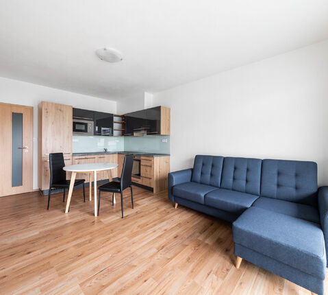 K dlouhodobému pronájmu nabízíme převážně zařízený byt 2+kk s terasou a garážovým parkovacím stáním v širším centru Plzně na Jižním Předměstí, ulice Poděbradova. Bytová jednotka je umístěna v 6. nadzemním podlaží (z celkových 8) energeticky velmi úsporné novostavby (třída B). Dispozice bytu zahrnuje obývací pokoj s kuchyňským koutem, ložnici, prostornou předsíň, koupelnu a samostatnou toaletu. Terasa přístupná z obývacího pokoje se rozpíná po celé šířce bytu. Byt je vybaven moderní kuchyňskou linkou s vestavnou elektrickou troubou, indukční varnou deskou, digestoří, myčkou nádobí, mikrovlnnou troubou, lednicí a mrazákem. Součástí vybavení je také rozkládací sedačka, jídelní stůl se židlemi, postel s rošty (bez matrací), šatní skříň, koupelnový nábytek a kompletní osvětlení. Všechna okna mají vnitřní žaluzie. Vytápění je centrální (Plzeňská teplárenská), totéž dodávka teplé vody. Spotřeba energií je měřena samostatně pro každý byt. Středová poloha bytu v zatepleném domě přispívá nejen k vyššímu tepelnému komfortu, zvláště v zimních měsících, ale také k úspoře nákladů na jeho vytápění. Pro TV přenos je k dispozici společná anténa. Připojení k internetu s rychlostí až 2 Gb/s zajišťují poskytovatelé jako O2, Vodafone, T-Mobile a další. Cenové podmínky pronájmu: • Nájemné 17.900 Kč/měsíc • Zúčtovatelné zálohy na energie a služby včetně elektřiny 3.500 Kč/1 osoba/měsíc 4.000 Kč/2 osoby/měsíc • Jistota (vratná kauce) 35.000 Kč • Provize RK 21.700 Kč Pro bližší informace či domluvení prohlídky volejte na uvedený mobilní telefon. Pro zjištění rozměrů místností a objektů v prostoru využijte možnost měření ve virtuální prohlídce pomocí ikony pravítka v levém dolním rohu.