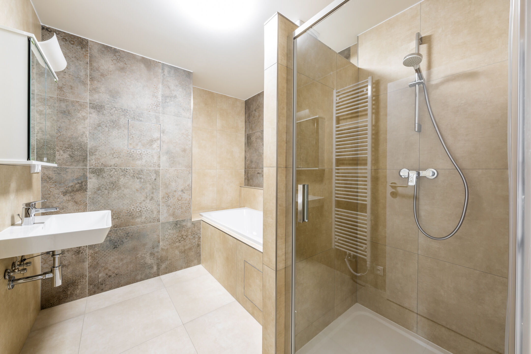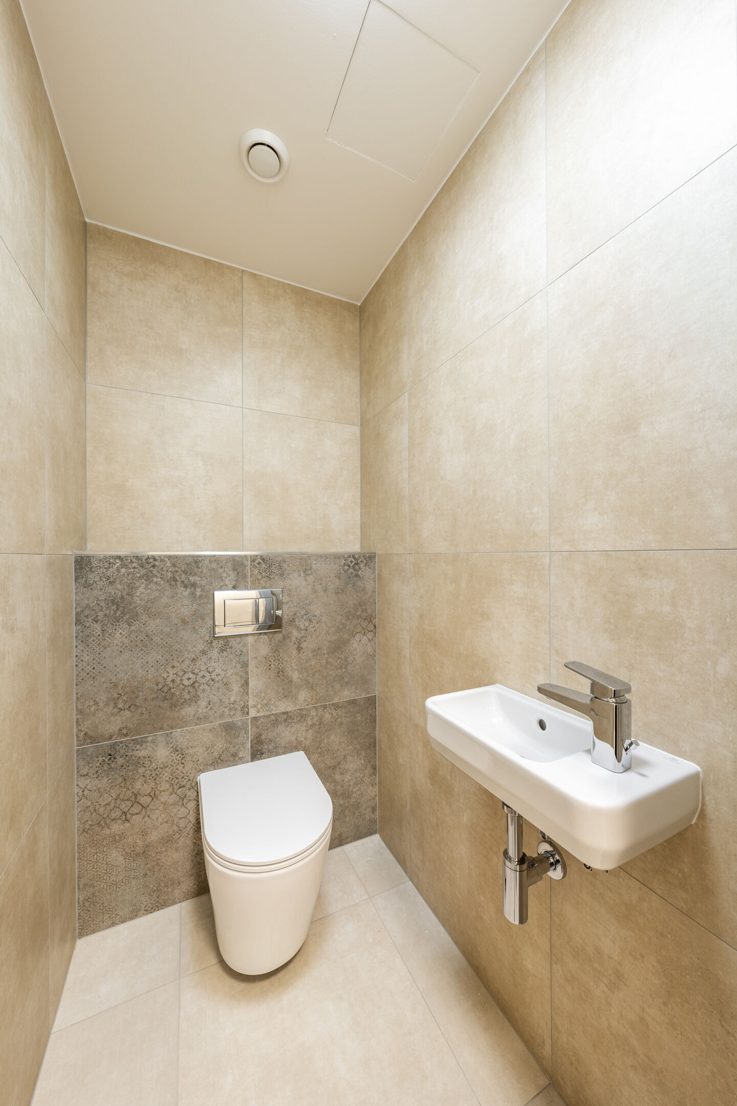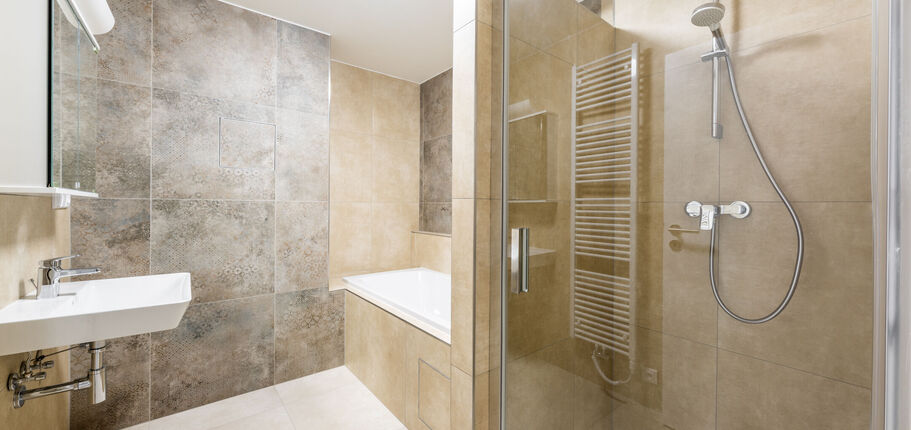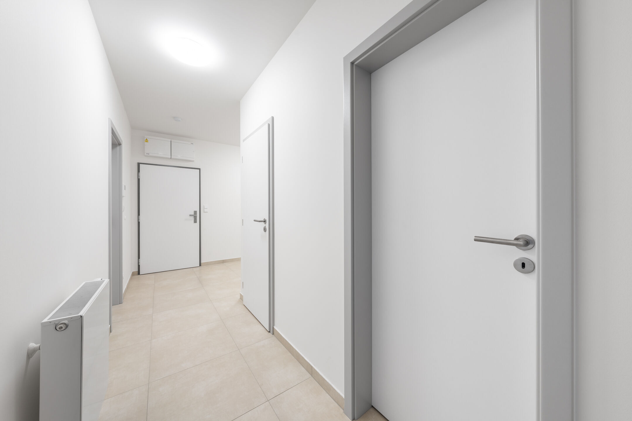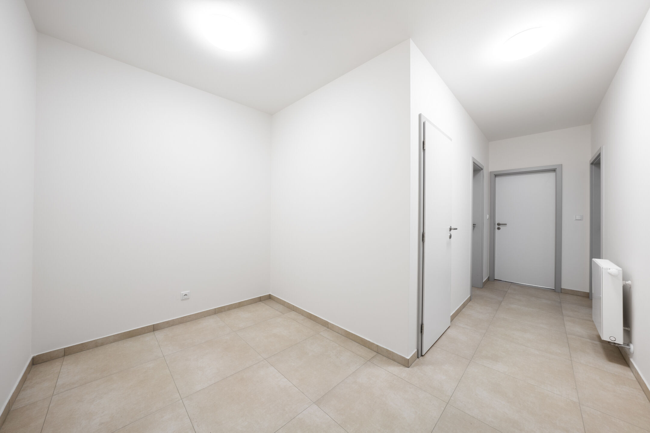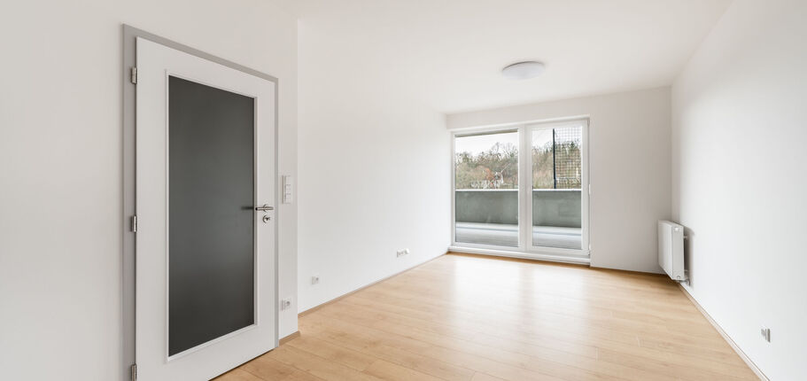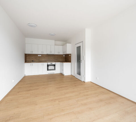 Dispozice bytu je velmi praktická. Po vstupu do bytu se nachází předsíň, na kterou navazuje centrální chodba zajišťující přístup do všech částí bytu, a to do obývacího pokoje s kuchyňským koutem, ložnice, komory, koupelny a samostatné toalety. Dominantou obou obytných místností jsou velkoformátová francouzská okna, která interiéru dodávají množství denního světla a zároveň umožňují přímý vstup na terasu. Ta se rozprostírá po celé šířce bytu a nabízí ideální prostor pro odpočinek i posezení na čerstvém vzduchu.