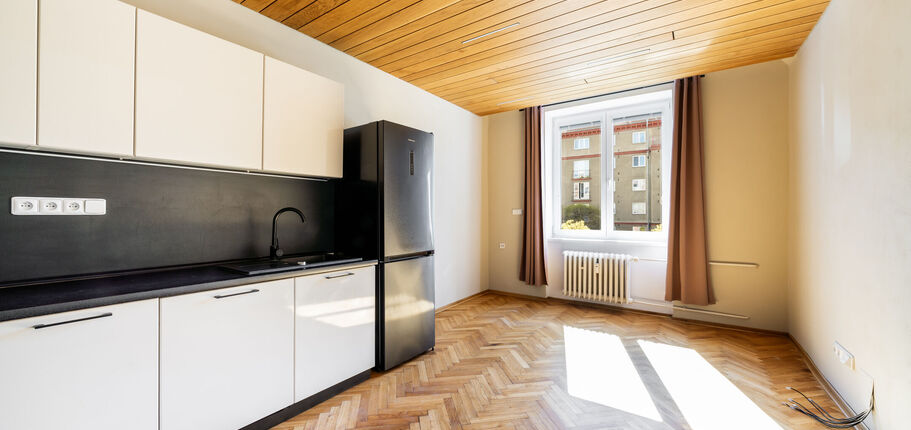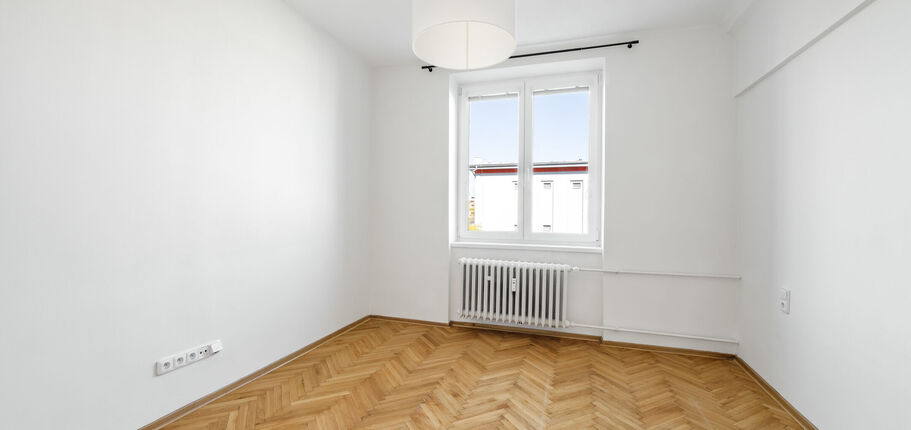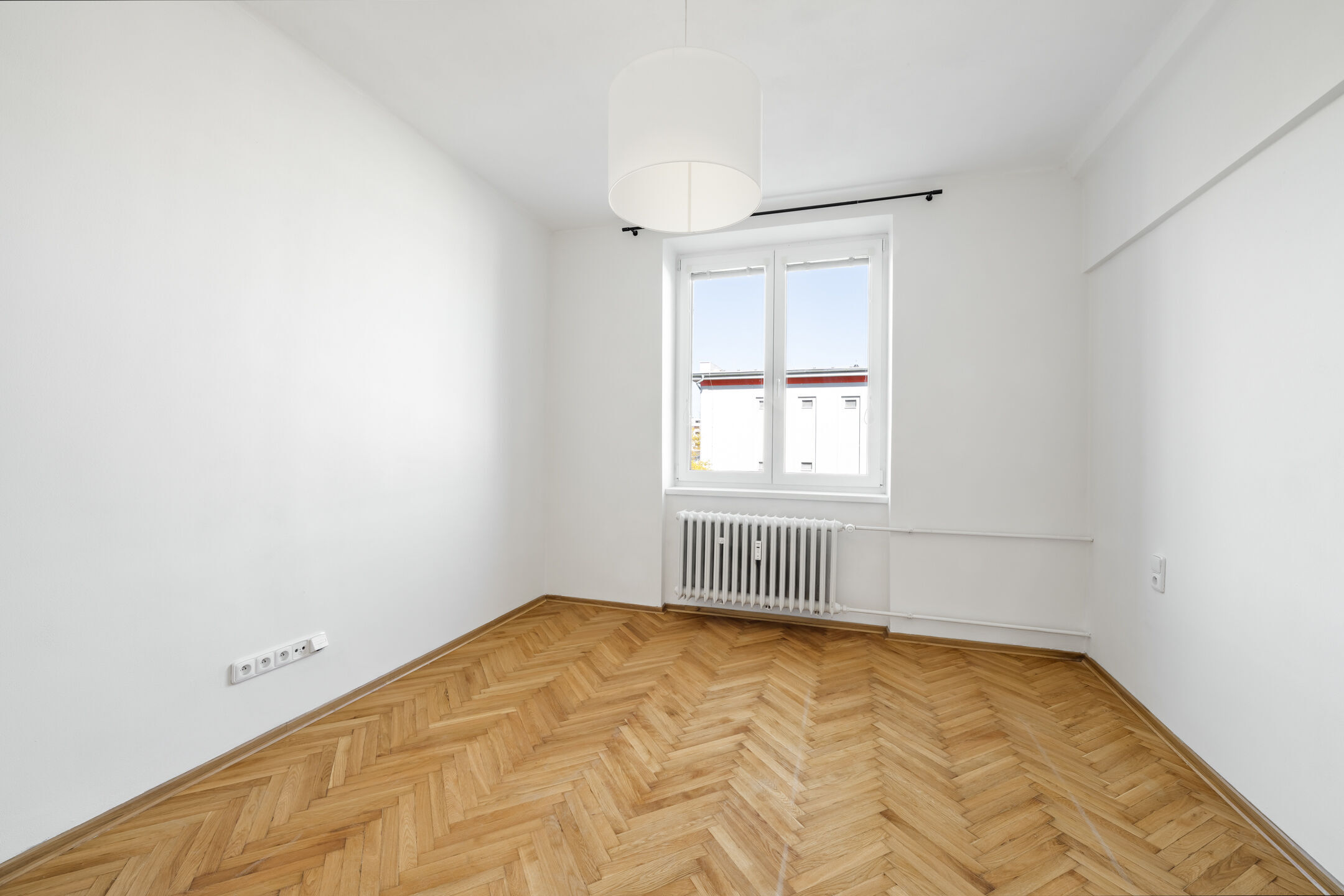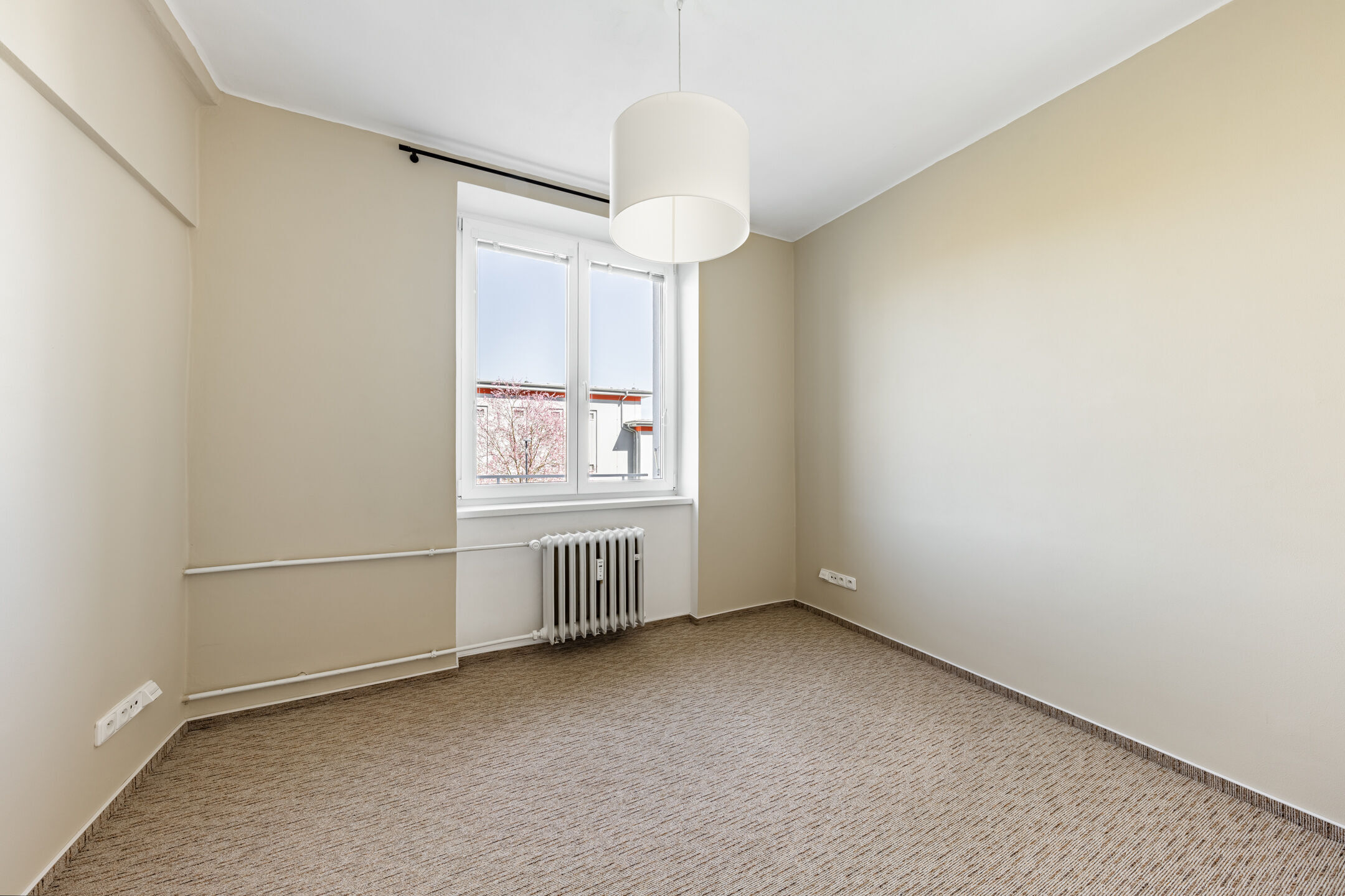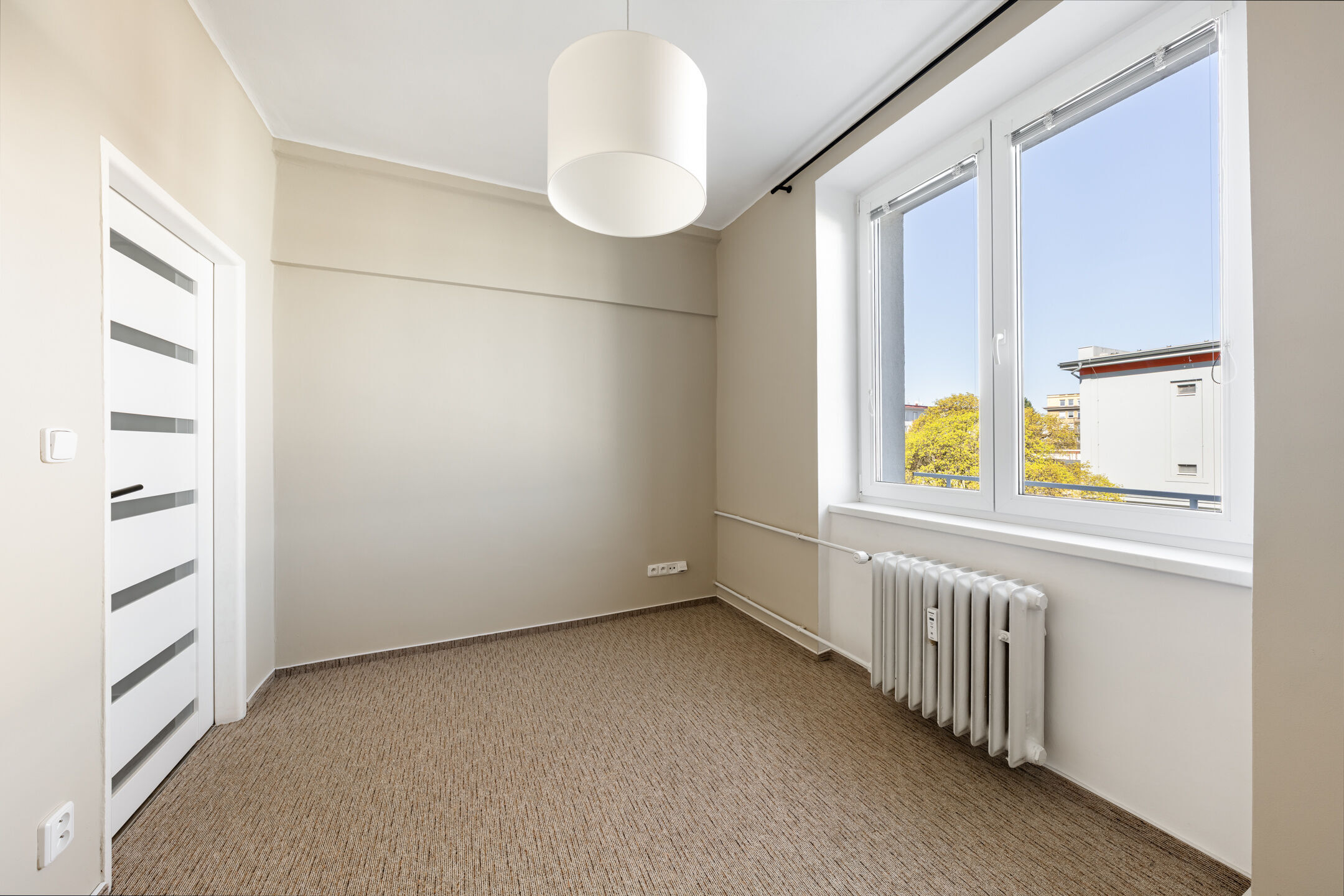 Dispozice bytu je velmi praktická. Ze vstupní předsíně a navazující chodby vedou samostatné vstupy do všech částí, a to do obývacího pokoje s kuchyňským koutem, ložnice, samostatného pokoje, koupelny a na oddělenou toaletu. K bytu náleží sklepní kóje (2 m2) umístěná v suterénu domu.
