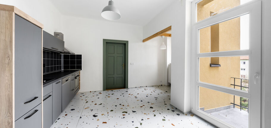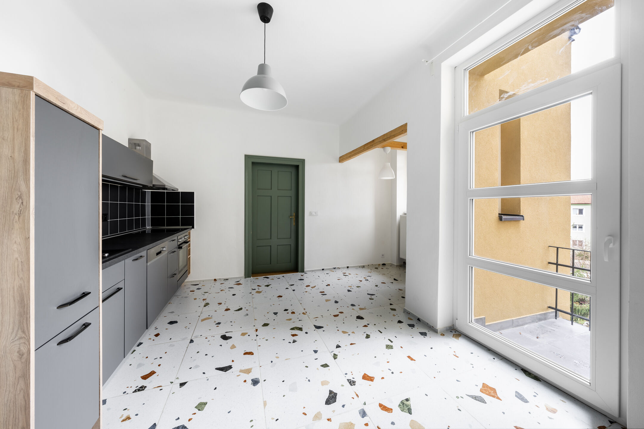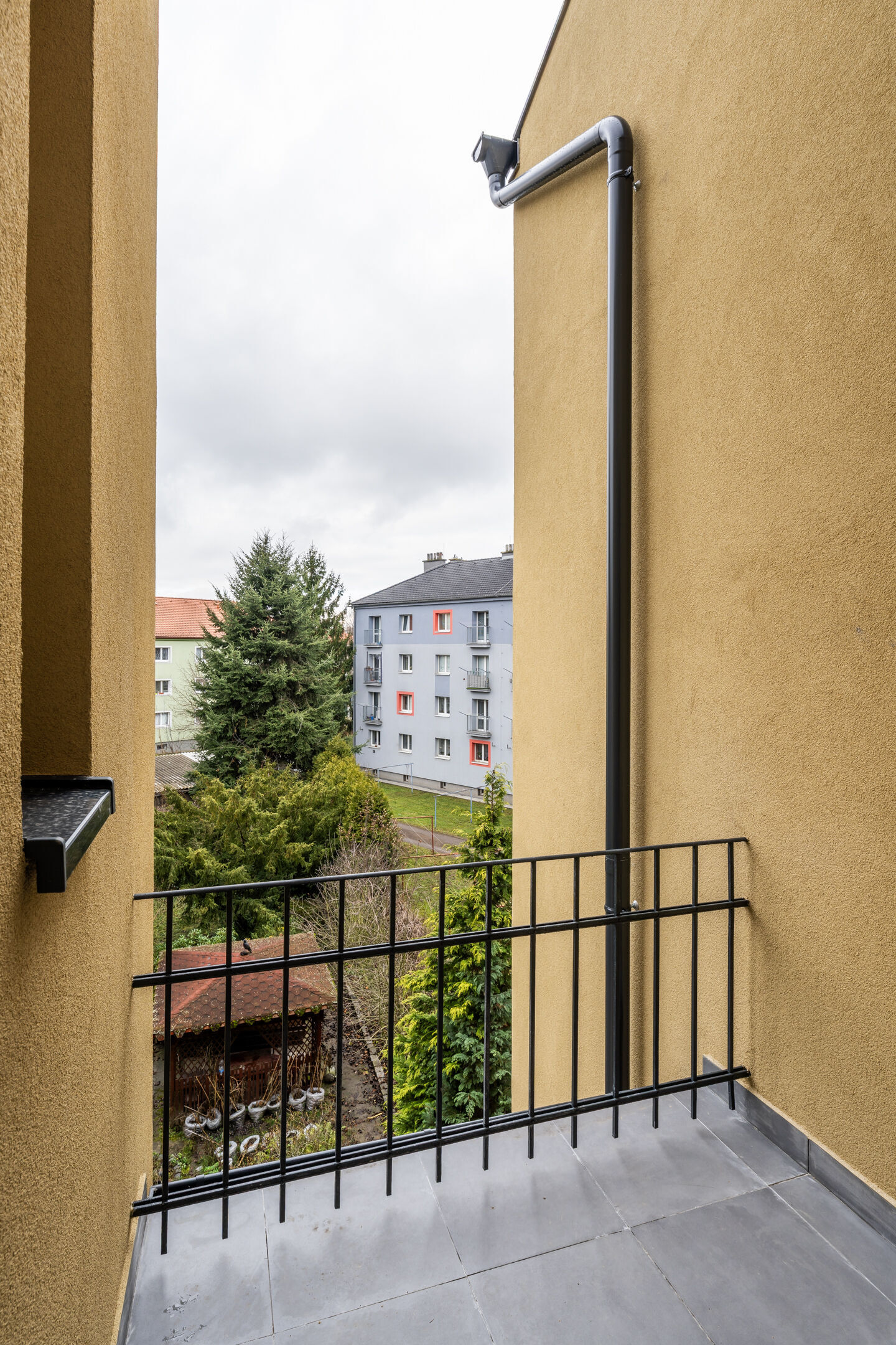 Dispozice bytu zahrnuje prostornou kuchyň s jídelnou, obývací pokoj, ložnici a koupelnu s toaletou. Balkon přístupný z kuchyně orientovaný do klidného vnitrobloku.