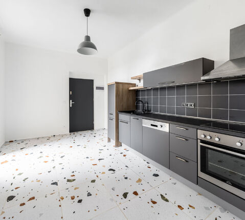 Byt je zařízený moderní kuchyňskou linkou včetně vestavné sklokeramické varné desky, digestoře, elektrické trouby a myčky nádobí. Vytápění bytu je ústřední, totéž dodávka teplé vody.