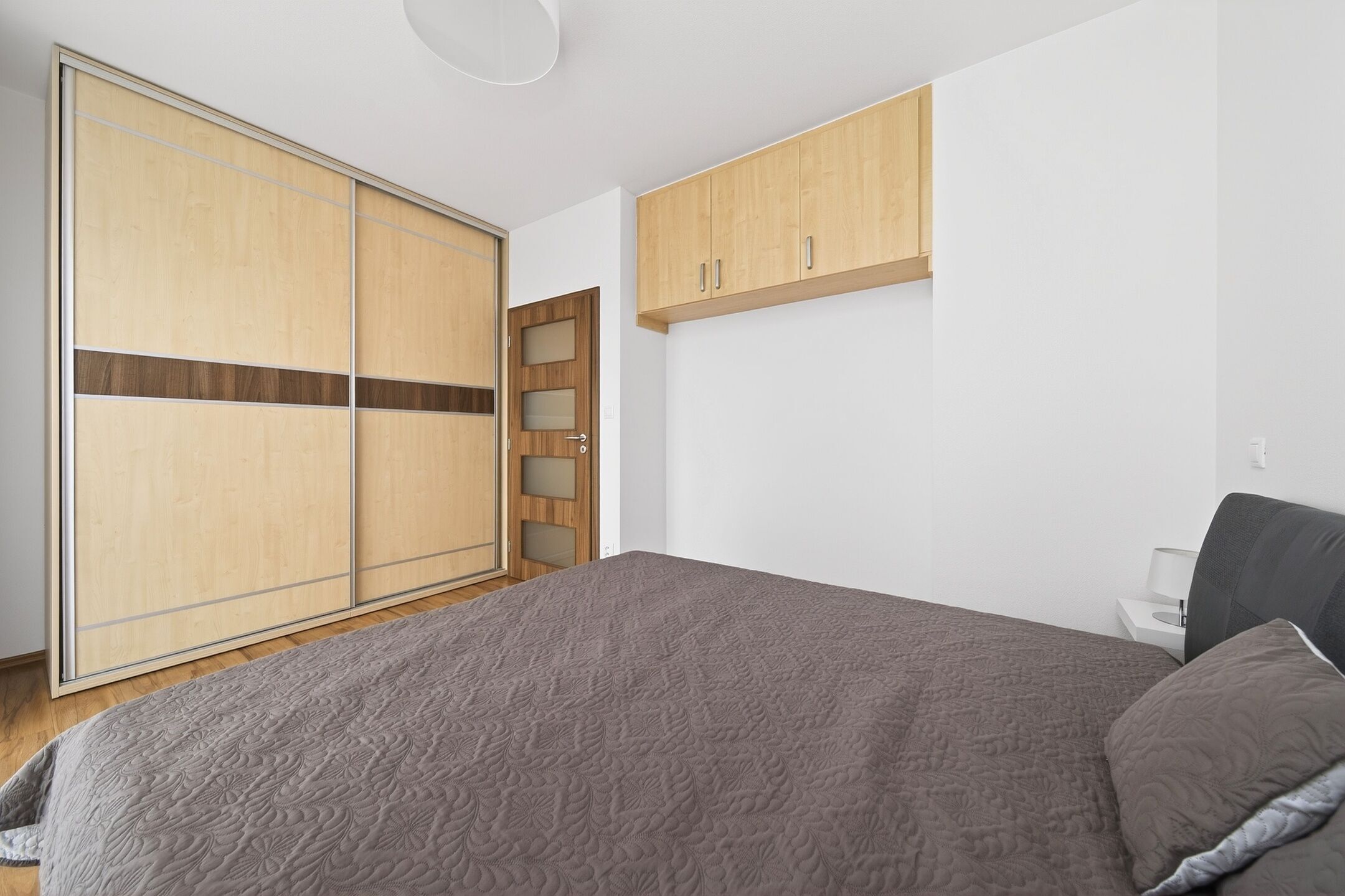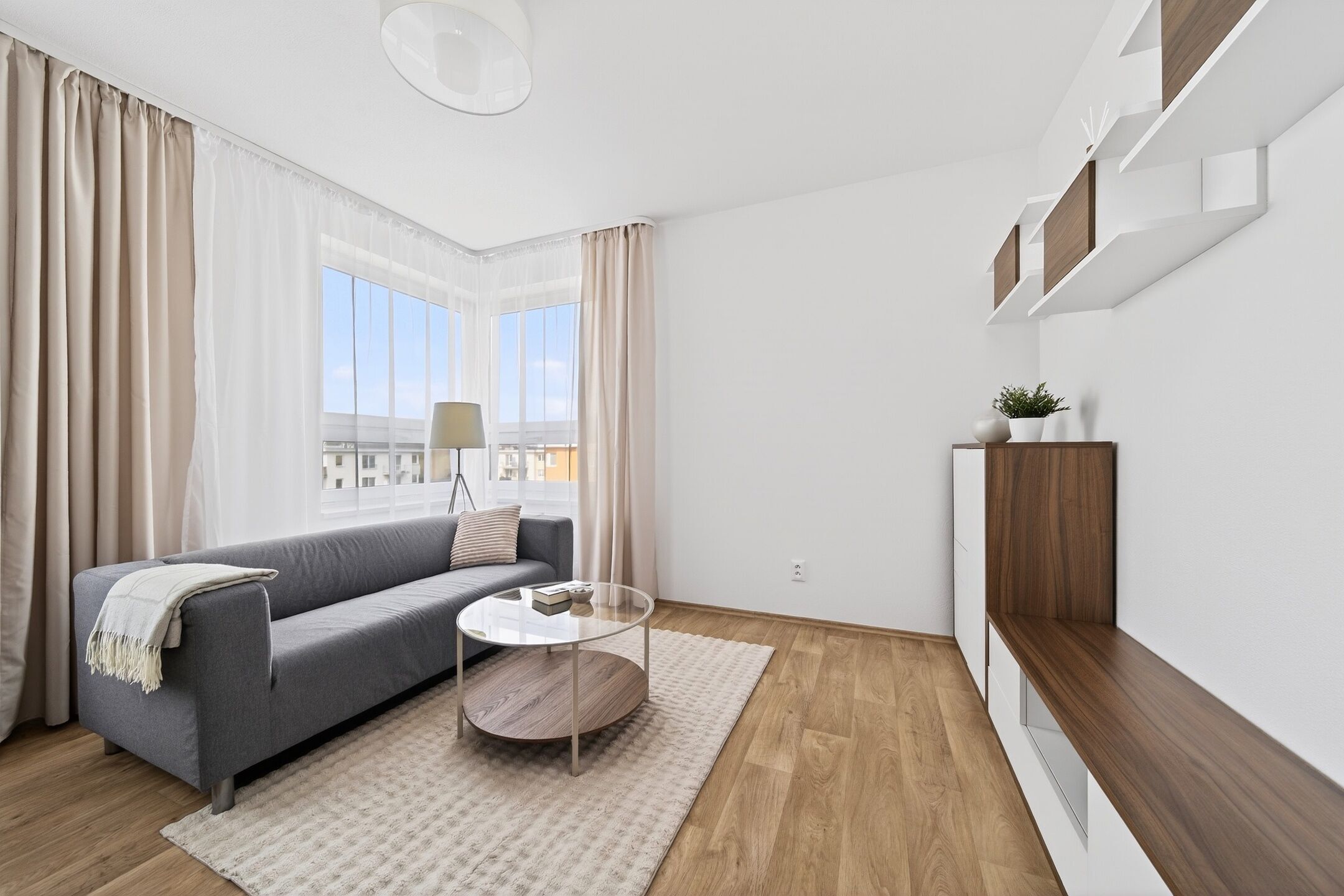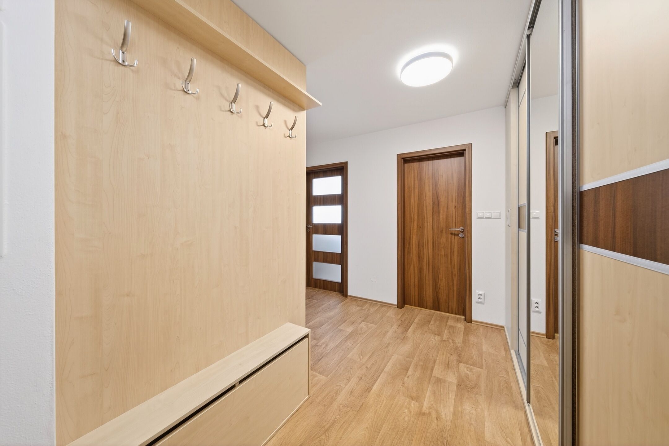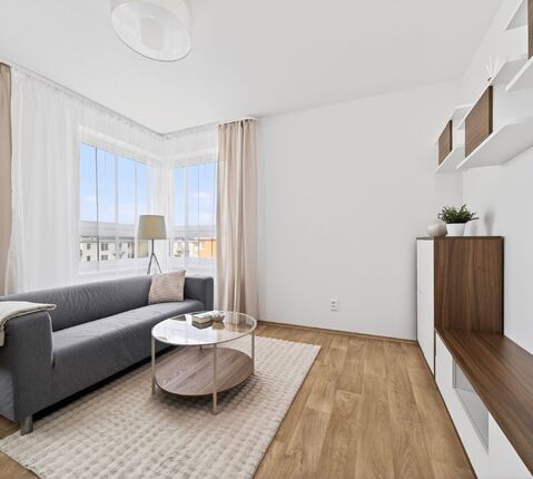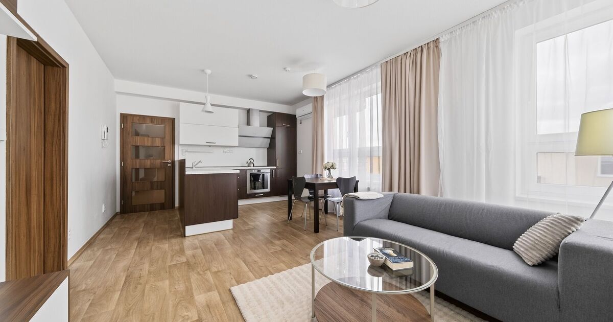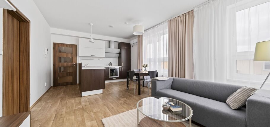 Byt je vybavený kuchyňskou linkou včetně vestavné elektrické trouby, varné desky, digestoře, myčky nádobí, ledničky a mrazáku. Dále je součástí vybavení jídelní stůl se židlemi, pohovka, konferenční stolek, obývací stěna, dvojlůžko (bez matrací), noční stolky, vestavěné skříně v ložnici i předsíni, samostatná skříň v pokoji, věšák, výklopný botník, pračka a venkovní posezení na terase. Samozřejmostí jsou také záclony, závěsy, koupelnový nábytek a kompletní osvětlení.