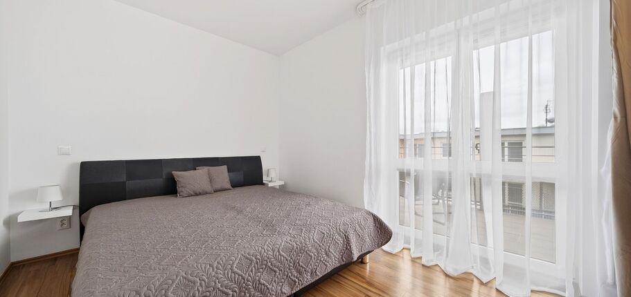 Dispozice bytu je velmi praktická. Ze vstupní předsíně vedou samostatné vstupy do obývacího pokoje s kuchyňským koutem, ložnice, koupelny i na oddělenou toaletu. Pouze samostatný pokoj je přístupný z obývacího pokoje s kuchyňským koutem. Z ložnice je přímý vstup na terasu.