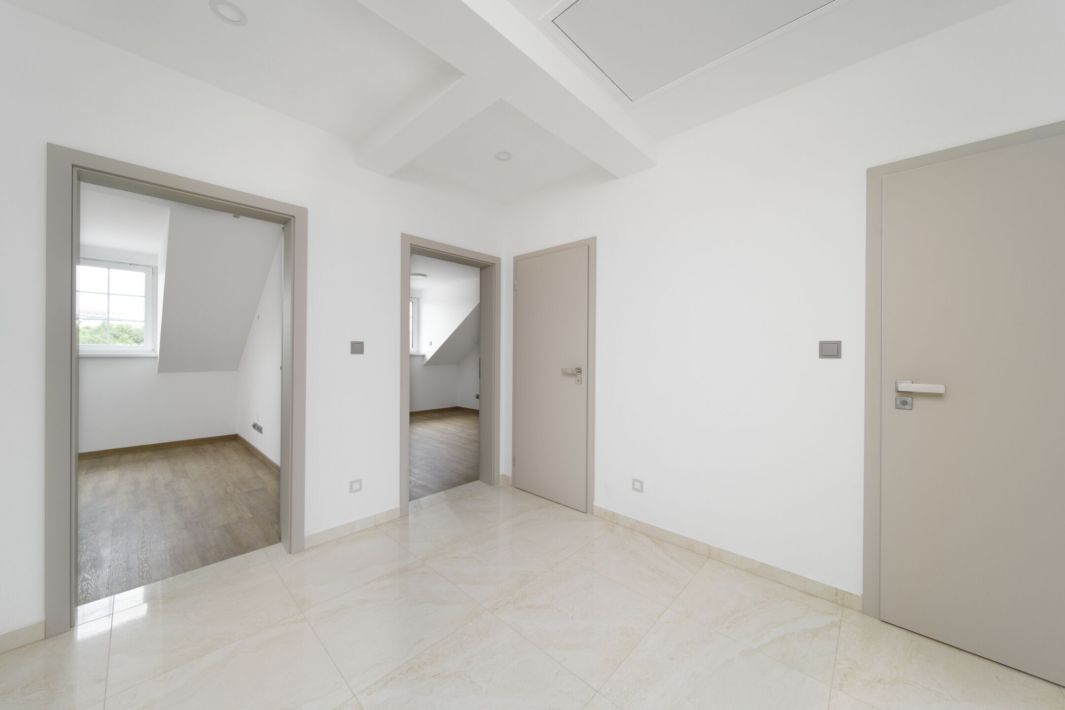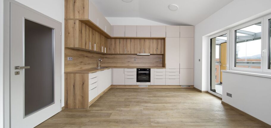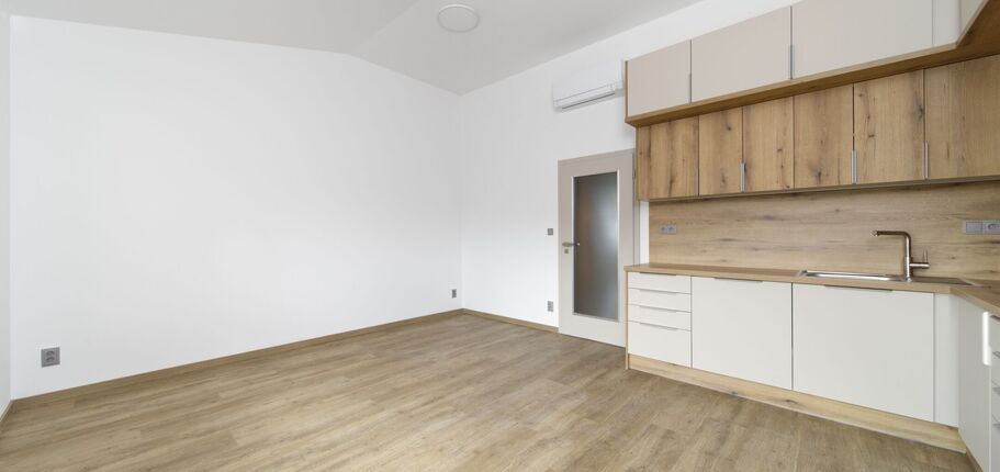 Součástí vybavení je moderní kuchyňská linka v nadčasovém designu, která zahrnuje vestavnou elektrickou troubu, indukční varnou desku, digestoř, myčku nádobí a ledničku s mrazákem. Koupelna je vybavena prostorným sprchovým koutem, dvojitým umyvadlem zasazeným do skříňky se šuplíky a praktickou zrcadlovou skříňkou. Nechybí ani přípojka na pračku a sušičku. Toaleta je oddělená a vybavena také bidetovou sprškou. V předsíni i obývacím pokoji se nachází vestavěné skříně na míru, které poskytují velkorysý úložný prostor. Celý interiér doplňuje moderní stropní i podlinkové osvětlení.
