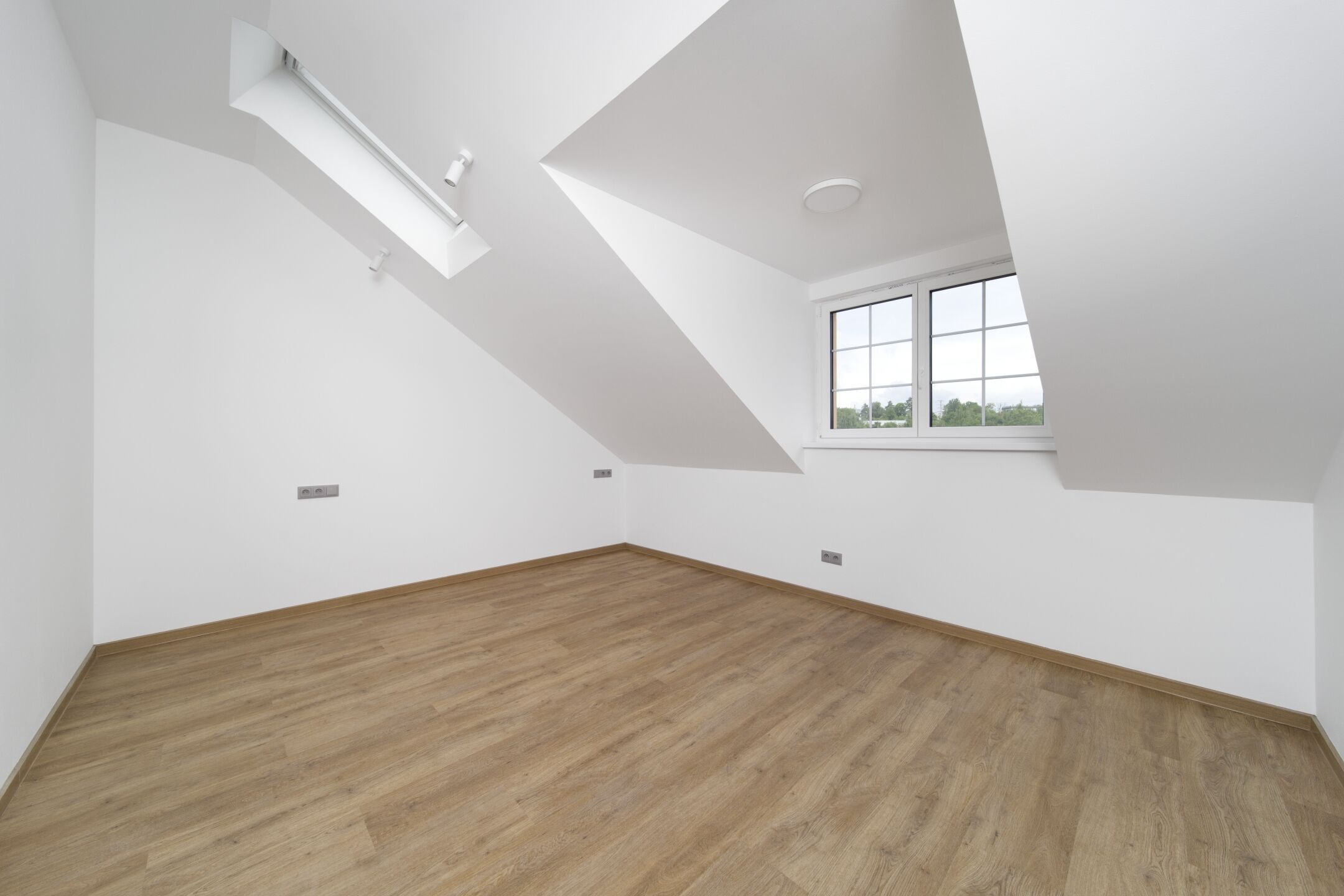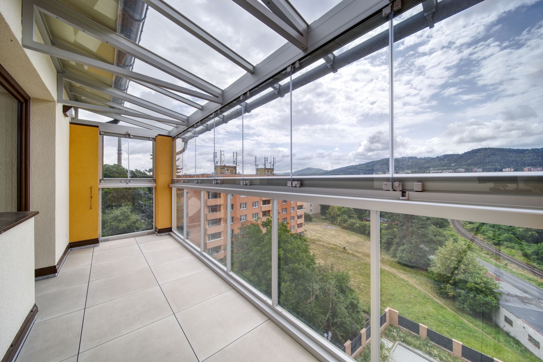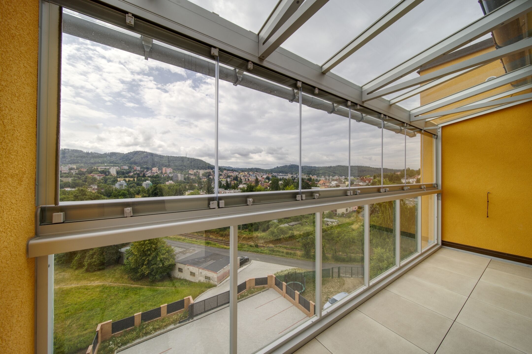 Dispozice bytu je velmi praktická. Ze vstupní předsíně je samostatný vstup do všech místností, a to do obývacího pokoje s kuchyňským koutem, ložnice, dětského pokoje, komory, koupelny a na samostatné WC. Z obývací části je přímý vstup na zasklenou lodžii, která nabízí krásný výhled na centrum města a široké okolí. Díky zasklení je možné lodžii pohodlně využívat i v chladnějších měsících. Velkorysé úložné možnosti nabízí podkrovní prostor přístupný po skládacích půdních schodech přímo z bytu (není zachyceno na fotografiích). K bytu náleží zděná sklepní kóje (2 m²) v suterénu domu.