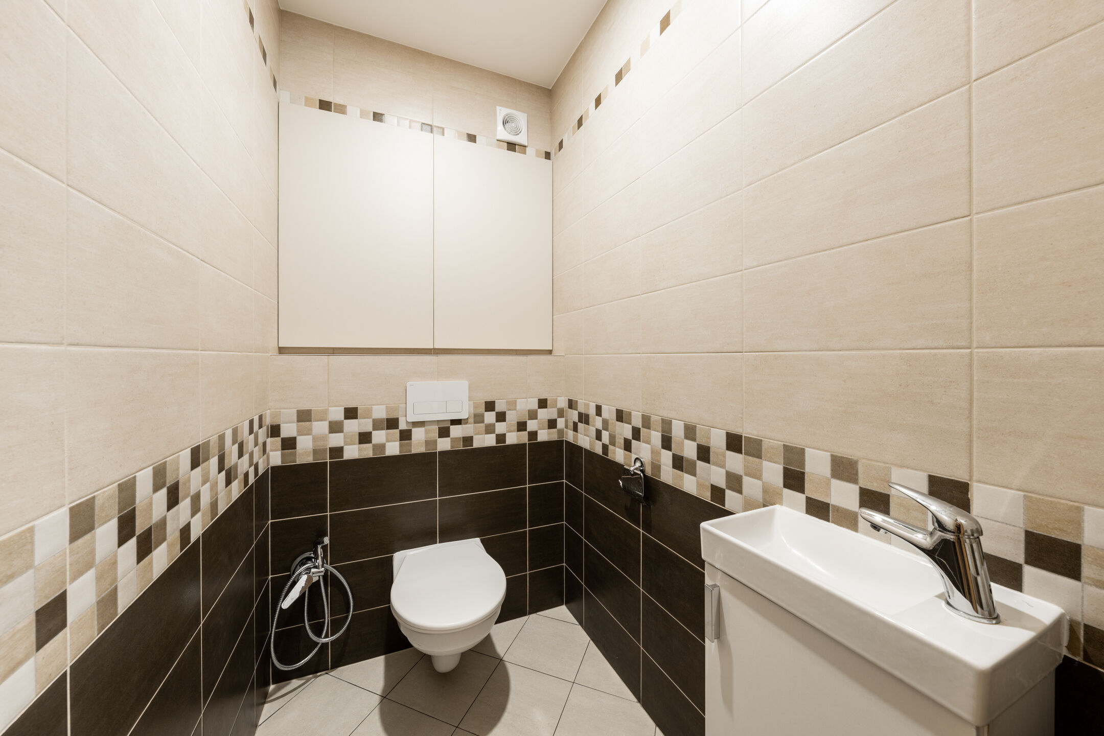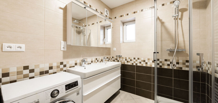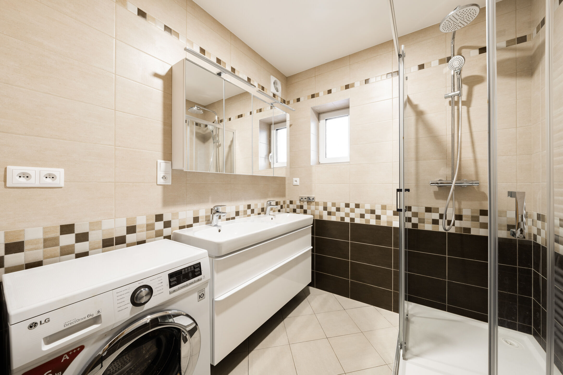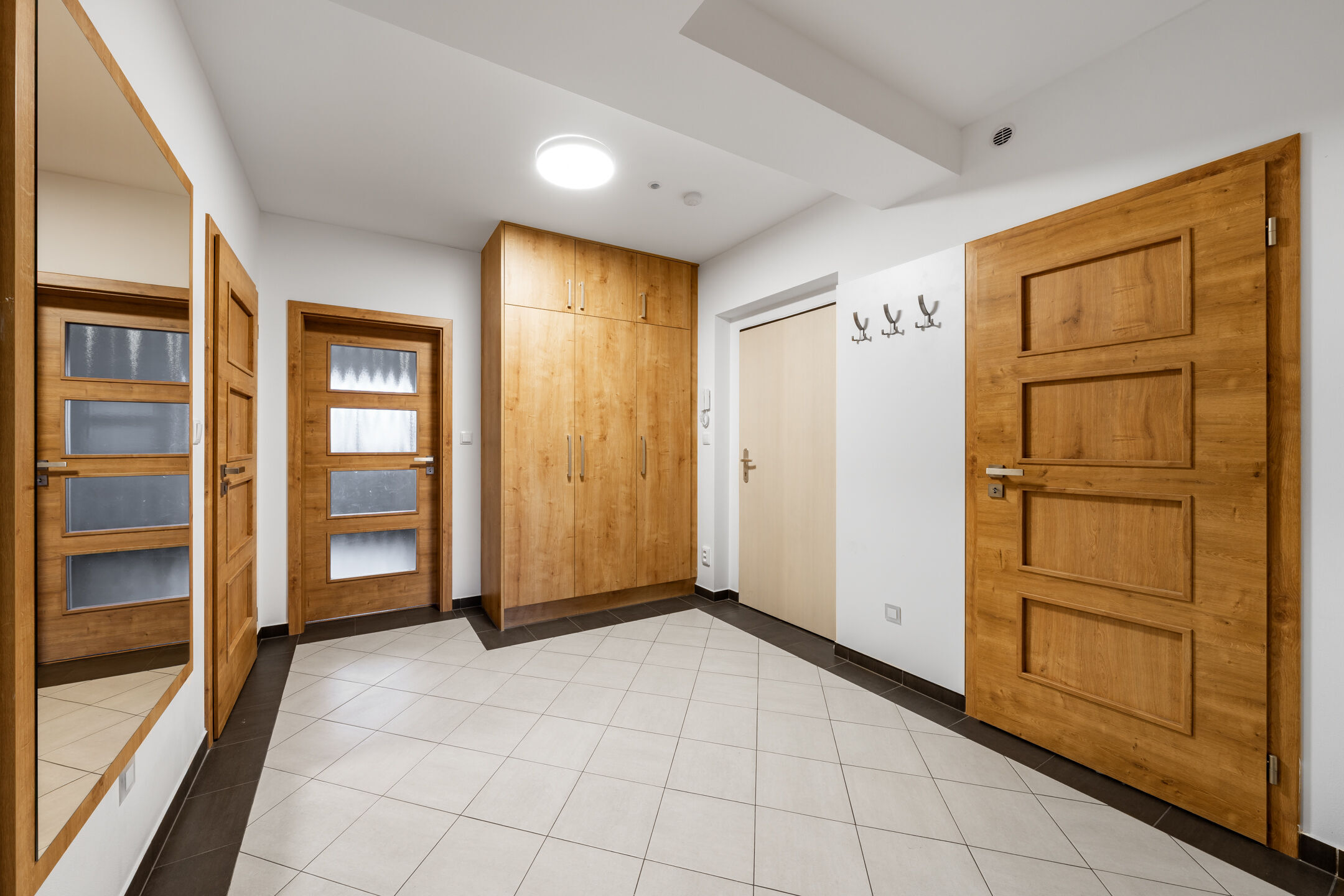 Součástí vybavení je moderní kuchyňská linka, která zahrnuje vestavnou elektrickou troubu, elektrickou varnou desku, digestoř, myčku nádobí a ledničku s mrazákem. Koupelna je vybavena prostorným sprchovým koutem, dvojitým umyvadlem zasazeným do skříňky se šuplíky a praktickou zrcadlovou skříňkou. Nechybí ani přípojka na pračku a sušičku. Toaleta je oddělená a vybavena také bidetovou sprškou. V předsíni se nachází vestavěné skříně. Celý interiér doplňuje stropní i podlinkové osvětlení.