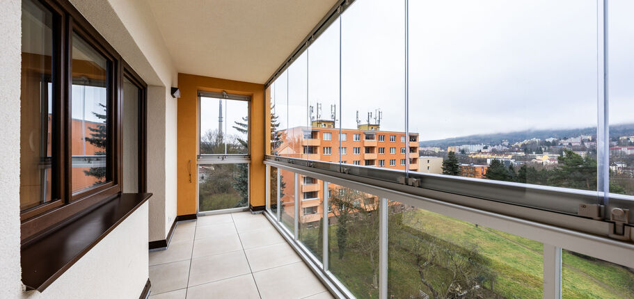 Dispozice bytu je velmi praktická. Ze vstupní předsíně je samostatný vstup do všech místností, a to do obývacího pokoje s kuchyňským koutem, ložnice, dětského pokoje, komory, koupelny a na samostatné WC. Z obývací části je přímý vstup na zasklenou lodžii, která nabízí krásný výhled na centrum města a široké okolí. Díky zasklení je možné lodžii pohodlně využívat i v chladnějších měsících. K bytu náleží zděná sklepní kóje (2 m²) v suterénu domu.