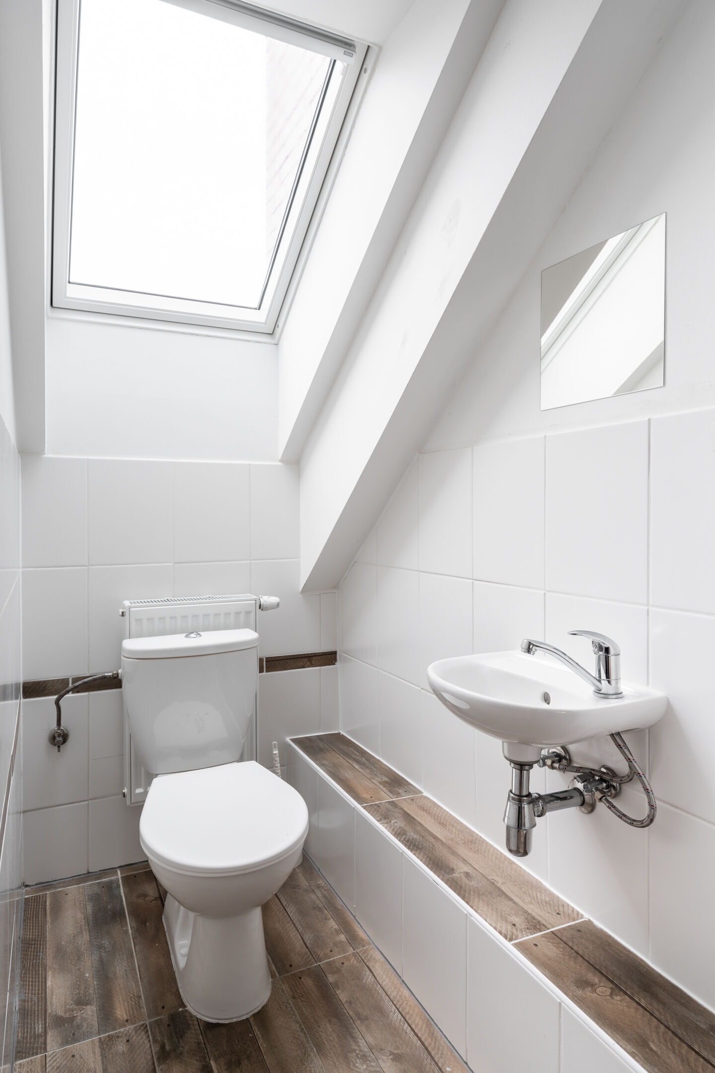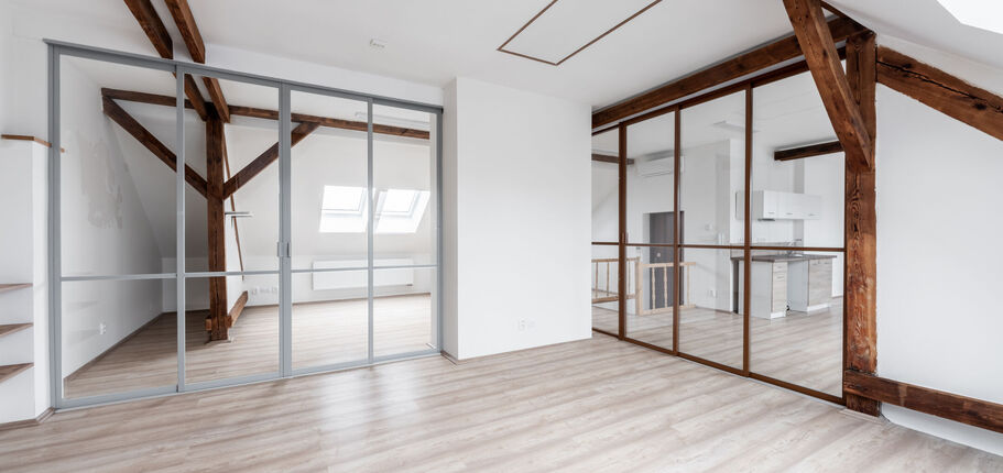 Ateliér je rozdělen skleněnými příčkami na dvě samostatné místnosti a centrální část s kuchyňskou linkou. Součástí prostor jsou také dvě samostatné toalety.